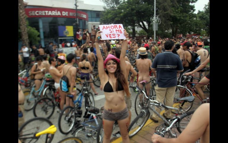 El recorrido de los ciclistas inició en avenida Vallarta y Arcos, hicieron una escala frente a las oficinas de la Secretaría de Movilidad donde exigieron "más ciclovías y menos muertos"; "ahí te encargamos (Mauricio) Gudiño". El trayecto continuó para concluir al mediodía en Plaza de la Liberación, frente al Teatro Degollado."Ahora sí me ves"; "Frágil", se leía en la piel de los manifestantes durante su pedaleo por calles de la ciudad. También plasmaron en sus cuerpos desnudos y semidesnudos: "Cuántas bicis blancas más", al demandar un alto a las muertes de ciclistas. "La calle también es mía", reclamaron.VE LA FOTOGALERÍA DE LA RODADAPeriódicamente se lanzaba la pregunta a los ciclistas: ¿Desnudos ante qué? El tráfico, era la respuesta masiva. De acuerdo a los organizadores participaron en el recorrido alrededor de dos mil ciclistas; mientras la Policía Vial calculó mil 200.Al finalizar el trayecto los pedalistas leyeron la Oda a la Bicicleta de Pablo Neruda.Guadalajara se une al World Naked Bike Ride (WNBR) que realiza rodadas al desnudo en 80 ciudades del mundo, el movimiento surgió en Vancouver, Canadá.Hay mínimos avancesA cuatro años de iniciado este movimiento en Guadalajara, impulsado por World Naked Bike Ride (WNBR), Abdel Vidrio, una de las organizadoras considera que hay algunos avances en el respeto a los ciclistas pero son mínimos, en general los automovilistas siguen tratándolos como si no tuvieran derecho a circular por las calles de la ciudad; les piden que se quiten, los ven como un estorbo, señala la joven. Ante la mirada de transeúntes en las calles y los múltiples teléfonos móviles que surgían en las manos de quienes observaban la singular manifestación, algunos de los participantes gritaban: "No me tomes fotos, respétame"."Lo que queremos reflejar con nuestro cuerpo desnudo es eso, nuestro cuerpo desnudo es frágil, nosotros (como ciclistas) somos frágiles" ante los automovilistas, ante una alcantarilla mal tapada, ante un inadecuado señalamiento, dice.¿Qué piden los ciclistas desnudos?En cuanto a exigencias dirigidas a las autoridades, Vidrio pidió se aplique el Plan Maestro de Movilidad no Motorizada para que haya rutas para el ciclista conforme a ese documento.¡Bájate del auto, súbete a la bici! Exhortaban los ciclistas durante su pedaleo.La demanda es que se sensibilice la población en la opción de movilidad no motorizada, se respete al peatón y al ciclista; cuestiona la excesiva dependencia de combustibles fósiles y busca enaltecer la fuerza e individualidad corporal.EL DATODe acuerdo al estudio Origen-Destino de 2008, cada día se realizan 220 mil viajes en velocípedo en la metrópoli.EL INFORMADOR / LETICIA FONSECA