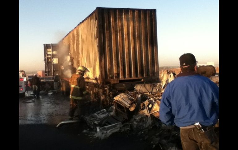 Jalisco | Sucede en el kilómetro 115 de la autopista San Juan de los Lagos–Lagos de Moreno Cierran autopista por choque e incendio de tráilers Sucede en el kilómetro 115 de la autopista San Juan de los Lagos–Lagos de Moreno Por: EL INFORMADOR 5 de enero de 2012 - 20:01 hs Tras el fuerte impactod e ambos vehículos, éstos se encontraban en llamas. / GUADALAJARA, JALISCO (05/ENE/2012).- Cerca de las 05:20 horas de este jueves se registró un fuerte accidente vehicular carretero en el municipio de San Juan de los Lagos, donde personal de Cruz Roja, Delegación Jalostotitlan, solicitó el apoyo de la Unidad Estatal de Protección Civil y Bomberos Jalisco (UEPCBJ), ya que luego de impactarse dos camiones de carga se incendiaron, a la altura del kilómetro 115 de la autopista San Juan de los Lagos–Lagos de Moreno. Tras el llamado de ayuda, de inmediato salieron oficiales destacamentados en la Base Regional San Juan de los Lagos a bordo de equipo motorizado contra incendio, dirigiéndose al lugar para prestar el apoyo requerido, y a su arribo se percataron que se trataba de un choque por alcance entre dos camiones pesados tipo tráiler, mismos que ya se encontraban en llamas a causa de fuerte impacto. Por lo que el personal de la UEPCBJ de inmediato comenzó el combate del fuego que ya consumía ambos vehículos, y al realizar labores de búsqueda de probables víctimas en coordinación con oficiales de la Unidad Municipal de Protección Civil y Bomberos de San Juan de los Lagos se percataron de que no había ninguna persona. Los camiones accidentados son un tráiler de la marca Kenworth, en color naranja, con numero económico 95 y placas de circulación 191-Dk-8, del Servicio Publico Federal, y debido a la acción destructiva que causó el fuego no fue posible conocer el nombre de la empresa transportista a la que pertenece, ya que dicho tractocamión terminó afectado; transportaba lavadoras. Al parecer el conductor del vehículo se había dado a la fuga. El otro vehículo es un tractocamión perteneciente a la empresa TM Transportes, de la marca Kenworth, en color blanco y azul, con numero económico 906 y placas de circulación 315-DG-7, también del Servicio Público Federal, el cual trasportaba rollos de lamina, en dos semirremolques. Por fortuna el conductor, de nombre Armando Garrido Amuro, de 32 años de edad, resultó ileso pese a la gravedad del accidente. Para atender el servicio, en el lugar se trabajó en coordinación con la Policía Federal, personal de mantenimiento de la autopista ICA y de la Cruz Roja Mexicana. EL INFORMADOR / MARTÍN PATIÑO Temas Seguridad Accidentes Carreteras de Jalisco Lee También Tras persecución policial, localizan 70 kilos de marihuana en Tuxpan Esta es la historia del "Marigalante" el barco hundido en Puerto Vallarta Choque en la colonia Aldama Tetlán deja dos lesionados Policía de Zapopan realiza cinco detenciones en una semana Recibe las últimas noticias en tu e-mail Todo lo que necesitas saber para comenzar tu día Registrarse implica aceptar los Términos y Condiciones