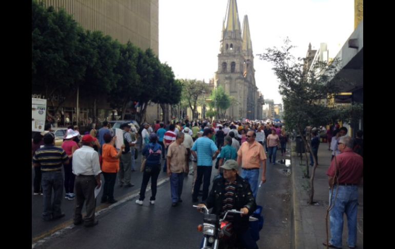 Jalisco | Fuerte carga vial afecta al Centro de la ciudad; protestan contra la reforma hacendaria Cierran avenida Alcalde por manifestación Fuerte carga vial afecta a la zona Centro de la ciudad; protestan contra la reforma hacendaria Por: EL INFORMADOR 7 de abril de 2014 - 10:29 hs Comerciantes se manifiestan en el Centro de Guadalajara, lo que ha provocado el cierre de avenida Alcalde. / GUADALAJARA, JALISCO (07/ABR/2014).- Cientos de personas, integrantes del Frente de Resistencia de Comerciantes del Estado, nuevamente tomaron las calles del primer cuadro de Guadalajara para mostrar su inconformidad con la reforma fiscal, modificación de Ley que, aseguran, "los llevará a la quiebra". Los inconformes bloquearon la circulación en el cruce de las avenidas 16 de Septiembre y Juárez, lo que causa serias complicaciones para los vehículos en el primer cuadro de Guadalajara. Salvador Cabrera, líder del frente al cual se han sumado otras agrupaciones con la misma molestia, expone que es urgente la intermediación del gobernador, Aristóteles Sandoval, con el Gobierno Federal. De otra forma, dice, "todos van a perder sus negocios". El problema: que "nadie los pela". Y en esa condición incluye también a los medios de comunicación, que, asegura, "siguen una línea". Pese a esto, afirma que estarán manifestándose "hasta que nos quiebren"; "hasta que nos lleven al fracaso". El Frente de Resistencia de Comerciantes del Estado ha mostrado abiertamente su oposición a la Reforma que impulsa el Gobierno de la República, pues han encontrado más obstáculos que facilidades para operar sus negocios bajo el nuevo régimen fiscal. "Nosotros no vamos a dejar de salir a las calles, porque tenemos dignidad y porque somos muy fuertes en todo esto". EL INFORMADOR / ISAACK DE LOZA Temas Manifestaciones en Jalisco Vialidad Centro Histórico Comercio Recibe las últimas noticias en tu e-mail Todo lo que necesitas saber para comenzar tu día Registrarse implica aceptar los Términos y Condiciones