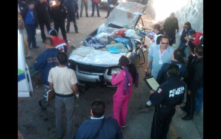 Jalisco | El vehículo cayó de un puente Cinco mueren en volcadura sobre carretera a Zapotlanejo El accidente que deja saldo mortal ocurrió a la altura del kilómetro 470 Por: EL INFORMADOR 24 de diciembre de 2010 - 08:11 hs Elementos de Protección Civil municipal acudieron a asegurar los cuerpos del accidente sobre carretera a Zapotlanejo. M. PATIÑO / ZAPOTLANEJO, JALISCO (24/DIC/2010).- Esta mañana, sobre la autopista a Zapotlanejo, a la altura del kilómetro 470, un vehículo Jetta, en color gris, modelo 2011, con placas del estado de Puebla, se volcó tras caer de un puente, quedando sobre la carretera libre Guadalajara-Zapotlanejo, sobre el kilómetro 163. El accidente dejó como saldo cinco muertos. Aparentemente se trata de una familia completa compuesta por dos adultos y tres menores de edad de entre 10 y 14 años. Hasta el momento solamente una persona ha sido identificada, debido a que traía una credencial de elector a nombre de Martha Morales Lechuga, de 44 años. Al lugar acudieron paramédicos de la Cruz Roja y elementos de Protección Civil municipal. EL INFORMADOR / MARTÍN PATIÑO Temas Seguridad Accidentes con muertes en Jalisco Cruz Roja Zapotlanejo Lee También Paquetazo 3×1: Estos propietarios tienen hasta el 31 de octubre para cambiar placas Hamás revela nombres de los cadáveres que entregará a Cruz Roja en Gaza El supermercado más caro de Jalisco se encuentra en Guadalajara: Profeco Profeco revela cuál es el supermercado más económico de Jalisco Recibe las últimas noticias en tu e-mail Todo lo que necesitas saber para comenzar tu día Registrarse implica aceptar los Términos y Condiciones