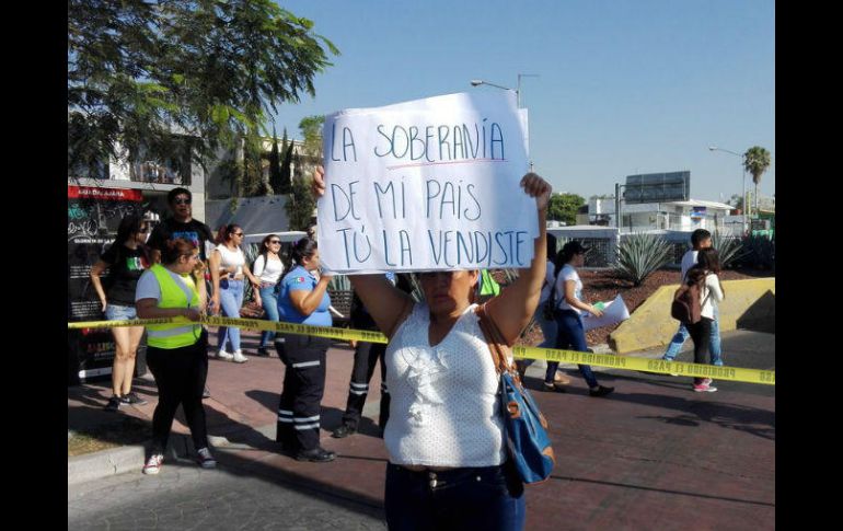 GUADALAJARA, JALISCO (12/FEB/2017).- Bajo la consigna "por la dignidad de México", cientos de ciudadanos salieron de La Minerva hacia Plaza Liberación para exigir que el presidente de Estados Unidos, Donald Trump, respete a los mexicanos.La marcha, a la que se unió la Universidad de Guadalajara, comenzó a las 10:40, con funcionarios de la Máxima Casa de Estudios a la cabeza, como el rector general, Tonatiuh Bravo Padilla.Mientras los manifestantes se reunían, tres mujeres cargaban letreros que rezaban frases contra el Gobierno mexicano, tratando de crear conciencia de que la dignidad comienza en casa. Mariachi se une a la manifestaciónDespués de media hora de una marcha en silencio, poco antes de llegar a la intersección de Américas e Hidalgo, un mariachi se sumó a la marcha "Vibra México".Los asistentes corearon, para empezar, "Cielito Lindo", para después gritar "¡UdeG, UdeG!" Y "¡México, México!".Antes de salir de La Minerva, Protección Civil de la Universidad de Guadalajara (UdeG) calcularon unos seis mil asistentes, pero al paso de las calles más personas se unían.El contingente avanzó por la avenida López Mateos, para luego tomar Hidalgo hasta el Centro Histórico. EL INFORMADOR / ELIZABETH MONDRAGÓN