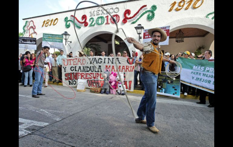 Jalisco | Además de las suertes con reata, los estudiantes llevaron algunos regalos al gobernador Con charrería y ciencia, estudiantes del CUCBA protestan en Casa Jalisco Presumen los avances científicos y logros en gestión ambiental de la Universidad de Guadalajara Por: EL INFORMADOR 14 de octubre de 2010 - 04:43 hs Además de las suertes con reata, los estudiantes llevaron algunos regalos al gobernador. E. BARRERA / GUADALAJARA, JALISCO (14/OCT/2010).- En una movilización que incluyó desde clases de ciencia y gestión ambiental hasta suertes con reata; estudiantes, profesores y directivos del Centro Universitario de Ciencias Biológicas y Agropecuarias (CUCBA) de la Universidad de Guadalajara (UdeG) se manifestaron la mañana de ayer en Casa Jalisco para exigir al Gobierno del Estado que entregue los 701 millones de pesos de contrapartidas federales pendientes. Tres académicos fueron los encargados de dirigirse a los participantes de la protesta, quienes rodeando a los expositores mostraban carteles con resultados de algunas investigaciones que han sido realizadas en el CUCBA. El profesor Eulogio Pimienta Barrios presumió que más de 600 investigadores de la UdeG pertenecen al Sistema Nacional de Investigadores (SNI). Lamentó que el mandatario estatal Emilio González Márquez no “presuma” los logros académicos de la casa de estudios. Después, Alfredo Feria Velasco, profesor con 34 años de trayectoria, habló de la importancia de la ciencia y de los avances dados en esta materia durante los últimos 50 años que, dijo, son más relevantes que los obtenidos durante los anteriores 500. Por otra parte, el profesor Miguel Magaña Virgen hizo una explicación dirigida a González Márquez sobre el significado de la gestión ambiental, y remató diciendo que “la gestión ambiental en Jalisco se ha hecho gracias a la Universidad de Guadalajara”. Después de los catedráticos, siguió el turno de los estudiantes, quienes dejaron en las puertas de Casa Jalisco algunos birotes que se elaboran en el CUCBA, así como tres piñatas de vaca, cerdo y burro, en representación de los productos cárnicos que también se producen en dicho centro universitario. Además, dos estudiantes hicieron suertes con la reata mientras otro de ellos exigía al gobernador del Estado la entrega de los recursos. El presidente de la Federación de Estudiantes Universitarios (FEU), César Barba Delgadillo, dijo que gracias a la defensa que realizó el CUCBA, el Estadio de Atletismo de los Juegos Panamericanos no se construyó en la ceja de la Barranca de Huentitán, tal y como se tenía previsto. Recordó que con la de ayer suman 21 movilizaciones, además de la megamarcha, y reiteró que la UdeG tiene los recursos humanos para realizar hasta 100 manifestaciones. Hoy jueves toca el turno a estudiantes y profesores del Centro Universitario de Ciencias Económico Administrativas (CUCEA) para continuar con las clases extramuros. Respaldarán protestas de la comunidad homosexual La FEU se solidariza con las protestas que la comunidad homosexual realice en contra del gobernador, luego de que declarara que los matrimonios entre personas del mismo sexo le dan “asquito”. El presidente del organismo estudiantil, César Barba Delgadillo, comentó que esperaban a representantes homosexuales en la manifestación de ayer. Como no sucedió, los estudiantes de la UdeG podrían reunirse con dicha comunidad durante la manifestación de hoy, y el viernes durante la movilización gay prevista a las afueras del Palacio de Gobierno en el Centro Histórico de Guadalajara: “Estoy proponiendo que nos solidaricemos con ellos, que a la hora que termine la clase inicie la protesta de ellos, que se haga en conjunto porque creo que sí merecen el respaldo de los universitarios. Somos una comunidad crítica, somos una comunidad con libertad y creo que nos tenemos que solidarizar”. Temas Gobierno del Estado UdeG Emilio González Presupuesto UdeG Lee También Un país donde la salud mental no existe en el presupuesto Leer y escribir, o la vida universitaria La UdeG celebra centenario de su refundación con un homenaje a sus figuras destacadas México reacciona a acuerdo de paz entre Israel y Hamás Recibe las últimas noticias en tu e-mail Todo lo que necesitas saber para comenzar tu día Registrarse implica aceptar los Términos y Condiciones