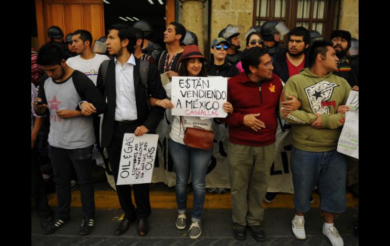 Jalisco | Con 24 votos a favor, 10 en contra, el dictamen de la reforma energética se aprueba Congreso de Jalisco aprueba reforma energética Con 24 votos a favor, 10 en contra, el dictamen de la reforma energética se aprueba en el Poder Legislativo de Jalisco Por: EL INFORMADOR 14 de diciembre de 2013 - 14:06 hs GUADALAJARA, JALISCO (14/DIC/2013).- Llevaron las cosas al extremo para alcanzar 24 votos de 34 votos disponibles; 10 votos en contra y el descontento en las calles. El Congreso del Estado convalidó la petición del Congreso de la Unión para modificar diferentes artículos de la Constitución Política de México, y con ello, concretar un paso más para la reforma energética. En una accidentada sesión, de la cual no se tuvo citatorio oficial, los legisladores tuvieron que tener provisiones adicionales, entre ellas, madrugar: a las 9 de la mañana ya había en el recinto más de 30 legisladores. Sin embargo, faltaba uno para poder iniciar con la comisión de Puntos Constitucionales. A las afueras del recinto se suscitaron hechos violentos que, cerca de las 10 de la mañana, impedían el paso de un legislador para lograr el quorum requerido a la sesión. El proceso legislativo indica que antes de que llegue al pleno, es la comisión donde se tiene que aprobar el dictamen. En este caso, la falta del diputado del partido Verde, Jesús Palos, impedía que se iniciara el proceso. Media hora después, el diputado ingresó por la azotea, pues las seis entradas al edificio fueron cercadas con vallas humanas que impedían el paso de los legisladores. El legislador, vestido de civil y sin ser reconocido, ingresó a uno de los restaurantes vecinos del edificio y logró ingresar al palacio legislativo alrededor de las 11 horas. La comisión convalida, el pleno reafirma Una vez reunida la comisión de Puntos Constitucionales, con seis votos a favor y cuatro en contra, el proyecto de dictamen fue turnado al pleno del Congreso. No pasó ni media hora cuando el pleno ya estaba listo para comenzar la discusión. Diputados de todas las fracciones iniciarían el debate. Uno de los principales críticos del proyecto del dictamen fue el diputado Enrique Velázquez, líder de la bancada del partido de la Revolución Democrática. Para él, la reforma energética es irresponsable y opaca, "Pemex es todo, menos una empresa ineficiente. (Con la reforma) vamos a ver cómo salen contratos para sus cuates". Luego hizo la propuesta de que la reforma debería someterse a referéndum, pero nadie lo secundó. "Le tienen miedo al referéndum, porque saben que una mayoría ciudadana revertiría una decisión". Bajará el precio de la luz y los alimentos: PRI Miguel Castro Reynoso, quien fuera el líder de la bancada hasta antes de tomar un cargo en el Partido Revolucionario Institucional (PRI) en Guadalajara, afirmó que él estaba a favor de la propuesta de reforma energética porque se garantizaba que el precio de la electricidad y los alimentos bajarían. Dijo que las empresas que exploten el petróleo "podrán incrementar el uso del gas barato y con ello reducir costos. Esto resultará en una disminución del precio de la luz en los consumidores. A mayor oferta de electricidad, esto incentivará la participación y mejores condiciones. Sobre los alimentos, dijo que su voto era a favor de la reforma porque "el incremento en la oferta a precios competitivos habrá de reducir nuestras importaciones de los fertilizantes importados. Esto habrá de reducir el costo en la producción de alimentos, lo que ocasionará alimentos más baratos para las familias mexicanas". Movimiento Ciudadano, agitador de y provocador de manifestaciones: PAN Gildardo Guerrero, líder de los panistas en el Congreso, hizo uso de la voz para recriminar la manera "facciosa" en que el partido Movimiento Ciudadano había organizado las manifestaciones a las afueras del recinto legislativo. Primero sacó recortes de periódicos donde se afirmaba que Brasil, un gobierno de izquierda, estaba a favor de la apertura en la explotación de los recursos energéticos. Luego fue subiendo de tono en las acusaciones, al llegar al punto en que llamó "agitadores" y "provocadores de los desmanes que hay afuera" a los diputados emanados del partido naranja. Al momento que decía esto se proyectaba en la pantalla del recinto legislativo unas fotografías donde se veían las camionetas de diputados como Guillermo Martínez Mora, que habían sido vandalizadas por los manifestantes, pues ya tenían grafitti en la pintura. También hubo fotos de los cristalazos y el uso de gas lacrimógeno utilizado por los cuerpos de seguridad para contener la manifestación en la puerta que da a la Calle Independencia. MC se desmarca, Alfaro no llega Desde la noche del viernes, tanto el líder de Conciencia Ciudadana, Enrique Alfaro, como los regidores del partido Movimiento Ciudadano (MC) en Guadalajara y Tlaquepaque hacían una invitación, a través de sus redes sociales, para detener esto que llaman "un atraco a la nación". Cuando Gildardo Guerrero acusó a los integrantes del Partido Movimiento Ciudadano de orquestar los desmanes al exterior del edificio, fue el líder de la bancada naranja, Clemente Castañeda quien desmarcó a su equipo, e inquirió: "El clima de violencia que se está generando a las afueras de este recinto, es responsabilidad de todos. Si alguien quiere señalar y buscar culpables, que se vea en el espejo. Esta reforma lo que está haciendo es polarizar las posiciones y en el fondo no hemos logrado solucionar el tema de la desigualdad". Por su parte, Enrique Alfaro Ramírez utilizó su cuenta de Twitter para avisar que no llegaría al Congreso del Estado, como estaba planeado. "Estoy estacionado a 5 min del Congreso. Me informan que me están esperando ahí porros profesionales del PRI para generar un problema mayor" Lo que es cierto es que, además de simpatizantes de MC, había gente del movimiento lopezobradorista Morena, estaban los lídere