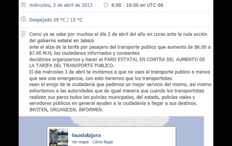 Jalisco | Desde Facebook se organizan para manifestar rechazo popular Convocan a paro ciudadano ante posible alza a tarifa del transporte Desde Facebook se organizan para manifestar rechazo popular en respuesta al proceso que intenta aumentar la tarifa autorizada Por: EL INFORMADOR 2 de abril de 2013 - 19:51 hs Imagen tomada de la convocatoria. ESPECIAL / GUADALAJARA, JALISCO (02/ABR/2013).- Pese a que una nueva suspensión mantiene en seis pesos el costo del pasaje en transporte público de la Zona Metropolitana de Guadalajara, cientos de usuarios de Facebook han confirmado su participación en la actividad denominada "Paro ciudadano en contra del aumento a la tarifa del transporte público". La invitación del grupo en la red social está redactada como sigue: "El día miércoles 3 de abril te invitamos a que no uses el transporte público a menos que sea una emergencia, con esto haremos que los transportistas vean el enojo de la ciudadanía que pedimos un mejor servicio del mismo". También hacen un exhorto a corporaciones de seguridad a brindar apoyo a la población de la misma manera que ha ocurrido cuando los transportistas deciden no ofrecer el servicio como medida de presión. Alejandro López Ibarra, uno de los organizadores de la actividad, explica que a menos de 24 horas de haber comenzado la difusión, la idea ha ten ido "una gran respuesta de la ciudadanía" que representa más de 12 mil personas invitadas de las que unas 600 han confirmado su participación. López Ibarra asegura que "esto apenas está empezando" y deja abierta la posibilidad de impulsar más acciones similares. "El fin es que la ciudadanía lo tome como suyo porque somos el verdadero poder en el país y nuestro estado", declara en entrevista virtual. EL INFORMADOR / SERGIO RODRÍGUEZ Temas Aumento transporte público Vialidad EL TEMA INFORMADOR Lee También Jóvenes golpean piñata de Salinas Pliego; exigen pague sus impuestos Detienen a cuatro jóvenes armados con fusiles automáticos en Sinaloa Preferencia y circulación Romería de la Virgen de Zapopan 2025: cierres viales, transporte y operativo de seguridad Recibe las últimas noticias en tu e-mail Todo lo que necesitas saber para comenzar tu día Registrarse implica aceptar los Términos y Condiciones