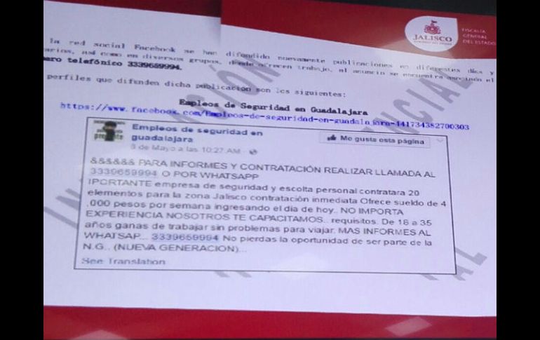 GUADALAJARA, JALISCO (21/JUL/2017).- La delincuencia organizada encontró un nuevo uso en las redes sociales adicional a las decenas de ciberdelitos que existen, pues ahora utiliza el Facebook para engañar a personas que, en su necesidad de empleo, acuden a entrevistas donde son privadas de su libertad y obligadas a unirse a las filas del cártel que opera en Jalisco. Esto se dio a conocer tras el hallazgo de un campamento en Tala, donde al parecer mantenían a unas 40 personas en esta situación, confirmó la Fiscalía General. "Están reclutando personas de bien que buscan un empleo en áreas de seguridad y que acuden a este llamado", informó el fiscal, Eduardo Almaguer. Este viernes se reveló el hallazgo de dos campamentos en un par de predios en la población de Navajas, en el municipio de Tala. Según los primeros reportes, en días pasados un hombre que era mantenido cautivo en uno de los campamentos logró escapar y dar aviso a las autoridades. La Fiscalía ya llevaba algún tiempo indagando varias desapariciones en la zona, pero fue esta persona la que los llevó a dar con el lugar el pasado martes. Cuando llegaron los elementos de la Fiscalía, sin embargo, los criminales ya lo habían desocupado junto con sus víctimas, excepto por dos que permanecieron y que fueron rescatadas, indicó Almaguer. En este sitio se encontraron artículos para entrenamiento de personal de seguridad en disparo, defensa y ataque. Según los tres hombres rescatados, eran entre 50 y 60 criminales los que los custodiaban para que no escaparan. "Desde su llegada los obligaban a construir sus alojamientos con madera y ramas"; esto, para que no pudieran ser vistos desde el aire. Por indicios las autoridades lograron dar con otro campamento "donde se encontraron restos óseos de personas". Peritos forenses trabajan desde el miércoles con estos restos para descubrir a cuántas personas corresponden mediante análisis de ADN. Desde mediados de junio, la Fiscalía recibió seis denuncias de desaparición que tenían en común que las personas avisaron a sus familiares que habían conseguido un empleo y que se iban a ir a capacitar a Tala. "A través de algunas publicaciones de Facebook se hacía invitaciones para que pudieran obtener trabajo como encuestadores, como escoltas, como policías municipales o de seguridad privada", dijo el fiscal. La Policía Cibernética investiga el origen de los perfiles de las cuentas de Facebook que engancharon a estas personas, que dicen pertenecer a una Fernanda Gallos, Wendy Valencia y Cristian Zavala y Mario Hernández. "Son los que ofrecían los números de contacto 333965 9994, 331232 1076 y 331942 1274 y que fue la manera en que los pudieron contactar, citar en un lugar cercano a Tala y trasladarlos a estos campamentos donde los tenían privados de la libertad". "Hacer un llamado a la sociedad para que quien tenga el interés de pertenecer a un grupo de seguridad no atienda los reclutamientos o invitaciones extrañas a través de una red social". Ante dudas sobre alguna oferta laboral se pueden comunicar a la Fiscalía al 3030 0869.