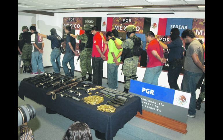 Jalisco | Los investigan por el homicidio de una funcionaria Detienen a 13 supuestos miembros de cártel Investigan por el homicidio de una funcionaria a los integrantes de esta supuesta célula Por: EL INFORMADOR 21 de junio de 2012 - 03:00 hs Presentados en la PGR. Los acusados fueron detenidos cerca de San Miguel El Alto. / GUADALAJARA, JALISCO (21/JUN/2012).- Como una importante y peligrosa célula del Cártel de Jalisco Nueva Generación (CJNG) fueron presentados 13 hombres que fueron detenidos con un arsenal y que son acusados de participar en el homicidio de una funcionaria de la Procuraduría General de Justicia del Estado, cometido en la cabecera municipal de San Miguel el Alto. También se les investiga por delitos de fraude y secuestro. En las instalaciones de la Procuraduría General de la República (PGR) fueron presentados 11 hombres y dos mujeres, a quienes les aseguraron siete fusiles de asalto, cuatro pistolas, dos granadas de fragmentación y 650 balas, además de 76 mil 425 pesos, tres automotores y 15 teléfonos celulares. El general de la XV Zona Militar, Gilberto Hernández Andreu, explicó que, según sus investigaciones, la célula delictiva pretendía establecerse en San Miguel el Alto para llevar a cabo secuestros y venta de droga. El grupo fue detenido por una vía carretera que conduce de San Miguel el Alto a Lagos de Moreno, cuando viajaban en tres vehículos. Uno de ellos, “El Killer”, dijo al ser detenido que participó en la ejecución de Laura Karina Aguas Trujillo, quien era actuaria de la fiscalía de San Miguel el Alto y que fue encontrada la tarde del martes en el predio Mirandilla, a 10 kilómetros de la cabecera municipal. Hasta ayer, la PGR no había informado si los detenidos serían arraigados o consignados. UNO X UNOLos detenidos Carlos Alberto Morales Huerta, “El Killer”, o “El Gordo”, líder de la célula y presunto homicida de la actuaria de la Procuraduría. Sergio Adrián Ojeda Mayo, “El Diablo”, otro líder. Rita María Castillo Escobar, “La Tita” o “La Beba”. Adriana de Jesús Díaz Díaz. Héctor Manuel Flores Cárdenas, “El Gringo”. Manuel Antonio Reyes Rivera. José Daniel Martínez Copto, “El Pepe”. Gonzalo Ramírez Garrido, “El Gallo” o “El Gonza”. Daniel López Hernández. Juan José Ruiz Pérez, “El Bobo” o “El Juanjo”. Diego Calleja Garrido, “El Garza”. Javier de Jesús González Torres. José Carlos Castillo Rodríguez, “El Negro”. Temas Seguridad PGR Detenidos en Jalisco Lee También Detienen a presunto homicida en Lomas de Oblatos Puerto Vallarta es reconocida como la mejor ciudad pequeña de Latinoamérica Suspenden clases en estos 9 municipios de Jalisco ante el paso de tormenta tropical 'Raymond' Clausuran centro de rehabilitación en Tonalá por posibles delitos Recibe las últimas noticias en tu e-mail Todo lo que necesitas saber para comenzar tu día Registrarse implica aceptar los Términos y Condiciones
