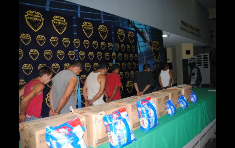 GUADALAJARA, JALISCO (09/JUN/2011).- Un grupo de hombres fueron detenidos por elementos de la Secretaría de Seguridad Pública del Estado, debido a que se encontraba saqueando varios vagones de un tren.En la base central de la Policía del Estado, fueron presentados Alfredo Cruz Terrones, de 24 años de edad, Nicolás López Meza, de 38 años, Bernardo López Meza, de 32.Además de Enrique Tovar Pulido, de 28 años de edad, Juan Carlos Corona Rodríguez de 31 años y Jaime Soto Zúñiga, de 37, todos vecinos de la colonia El Tapatío.De acuerdo con lo informado por el comandante Martín Muñoz, acudieron al cruce de las vías del tren ubicadas en la calle Rita Pérez Moreno, en la colonia mencionada, en el municipio de Tlaquepaque, debido a que personal de Ferromex, les reportó el robo de un vagón cargado con jabón en polvo.Al llegar los oficiales, lograron el arresto de las personas mencionadas y la recuperación de 39 cajas conteniendo bolsas de cinco kilos, 36 bolsas de un kilo cada una, 26 cajas conteniendo 18 kilos de jabón en polvo y 78 cajas de un kilo cada una.Los detenidos y la mercancía fueron puesta a disposición de la Procuraduría estatal para su investigación.EL INFORMADOR / OMAR RUVALCABA