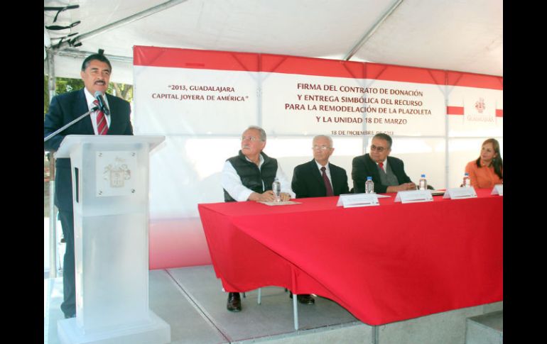 Jalisco | La CFE firma convenio con el Ayuntamiento tapatío para mejorar el espacio público Donan 5 MDP para la Plaza 18 de Marzo La CFE firma convenio con el Ayuntamiento tapatío para mejorar el espacio público Por: EL INFORMADOR 18 de diciembre de 2013 - 15:40 hs En el evento estuvo presente el presidente municipal de Guadalajara, Ramiro Hernández García (i). ESPECIAL / GUADALAJARA, JALISCO (18/DIC/2013).- El Ayuntamiento de Guadalajara y la Comisión Federal de Electricidad (CFE) firmaron un convenio por la mañana, con el cual la segunda institución realizó un donativo por cinco millones de pesos, a la primera que serán utilizados para acciones de mejora en la Plaza 18 de Marzo, y a su unidad deportiva, en el Oriente de la ciudad. Los recursos federales servirán para instalar un " CFE Ciber", con cinco computadoras e internet para los vecinos de alrededor; también se instalará una fuente a ras de piso para la recreación de los niños y para la promoción de la cultura del cuidado del agua; se ampliará la pista de trotar y se instalarán juegos infantiles, una pérgola con mesas y más árboles. En el evento estuvo presente el presidente municipal, Ramiro Hernández García; el gerente de la División de Distribución Jalisco de la CFE, Antonio Macías Padilla; además de Julio García Briseño, integrante del Consejo Directivo de la Comisión; y Ana María de Polanco Gómez, responsable de gestión social también de la instancia federal. EL INFORMADOR / LUIS HERRERA Temas Ayuntamiento de Guadalajara CFE Municipios Recibe las últimas noticias en tu e-mail Todo lo que necesitas saber para comenzar tu día Registrarse implica aceptar los Términos y Condiciones