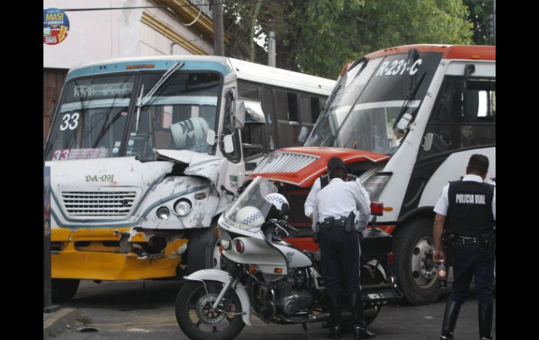 Jalisco | La colisión entre dos unidades del transporte público deja tres personas lesionadas Dos camiones chocan en el Centro tapatío La colisión entre dos unidades del transporte público deja tres personas lesionadas Por: EL INFORMADOR 22 de junio de 2014 - 20:20 hs Un camión de la ruta 231-C se impactó de costado con otro de la ruta 33. / GUADALAJARA, JALISCO (22/JUN/2014).- Dos camiones del transporte público protagonizaron un choque en la Zona Centro de Guadalajara; hubo tres personas lesionadas, entre ellos, uno de los conductores. Los hechos ocurrieron en el cruce de Pino Suárez y Manuel Acuña, donde se impactaron de costado un camión de la ruta 33, con número económico 33DA091, y uno de la ruta 231-C, con número 8665. De acuerdo con agentes de la Secretaría de Movilidad, fueron informados por testigos que al parecer el conductor de la ruta 33, no respetó el rojo del semáforo del cruce, por lo que fue impactado por el otro camión urbano. Aunque ambos camiones circulaban a baja velocidad, dos pasajeros, uno por camión, resultaron con golpes leves, por lo que fueron atendidos en la Cruz Roja del Parque Morelos. Mientras que un agente del Ministerio Público inició con las investigaciones del caso. Temas Seguridad Transporte Público Accidentes Lee También Omar 'N' es vinculado a proceso por presunto abuso sexual infantil agravado Estos son todos los cambios que tendrá el transporte público por el paso de la Romería Detienen a hombre señalado por abusar sexualmente de su hija Policías de Tlaquepaque aseguran contenedores con carga millonaria Recibe las últimas noticias en tu e-mail Todo lo que necesitas saber para comenzar tu día Registrarse implica aceptar los Términos y Condiciones