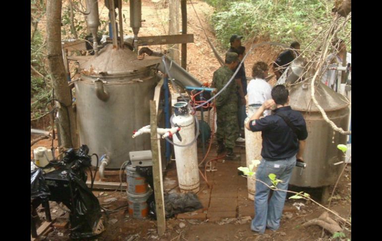 Jalisco | El lugar contaba con sofisticadas instalaciones y era operado por al menos 15 personas El Ejército Mexicano desmantela narcolaboratorio en La Huerta El lugar contaba con sofisticadas instalaciones y era operado por al menos 15 personas Por: EL INFORMADOR 25 de noviembre de 2010 - 03:03 hs Durante el operativo no se registraron detenidos debido a que las personas huyeron hacia el cerro. M. INFANTE / LA HUERTA, JALISCO (25/NOV/2010).- Un narcolaboratorio instalado con moderno equipo para procesar drogas sintéticas, ubicado en el predio “El Limoncito” del ejido El Palmar, en el municipio de la Huerta, fue desmantelado por elementos del Ejército Mexicano pertenecientes a la 41ª. Zona Militar, con sede en Puerto Vallarta. El comandante de la Zona, General de EM Gilberto Hernández Abreu, confirmó que durante el operativo de aseguramiento no se registró detención de persona alguna, ya que los sujetos huyeron hacia el cerro al percatarse, a distancia, de la presencia de personal militar. El sitio contaba con dos puntos de observación que instalaron en los cerros cercanos, explicó el mando castrense, y desde ahí presuntos “halcones” informaban de la presencia de alguna autoridad, por lo que rápidamente lograron escapar. El narcolaboratorio contaba con utensilios como mascarillas, guantes, mangueras, quemadores, matraces y bidones, que eran utilizados para la operación del laboratorio de drogas sintéticas. Además se aseguraron 40 kilos de metanfetamina ya preparada para su distribución, 15 kilogramos de mariguana, 80 tambos de plástico conteniendo desengrasantes, acetona, ácido clorhídrico y un líquido denominado “hexenol”, el cual se utiliza para el lavado de la droga. Así como sosa cáustica en costales, cuyo peso está por determinarse. También dos plantas de luz con gran capacidad, una planta portátil de enfriamiento de agua para condensadores, cuatro reactores gigantes de acero inoxidable, cuatro cilindros de gas, dos vehículos, una cuatrimoto y un campamento con 15 camas. De acuerdo con peritos de la Procuraduría General de la República (PGR) en el lugar se podrían producir al menos 30 kilos de crystal por día. Crónica Desierto y con sólo dos cachorros de raza Pastor Australiano, encontraron las tropas pertenecientes a la 41ª. Zona Militar, el narcolaboratorio ubicado en el predio conocido como “El Limoncito”, ubicado en el ejido El Palmar, municipio de La Huerta, Jal. Los operarios del lugar en donde se elaboraba la droga ilegal denominada “Crystal”, abandonaron a toda prisa el sitio, después de ser avisado por vigías que tenían apostados en puestos de observación ubicados en la parte alta de dos cerros cercanos. Personal militar localizó casas de campaña y otros objetos que corroboran la presencia de vigías que alertaron sobre la presencia de las fuerzas castrenses en “El Limoncito”. El acceso al sitio es a través de un camino de tierra con tramos en mal estado a causa de las lluvias del pasado temporal. Esta ruta parte de la carretera en construcción Villa de Purificación-Chamela, que a su vez entronca con la carretera federal 200, cerca de la desviación hacia el poblado de Punta Pérula. Lo escarpado del terreno obligó a los elementos de la Zona Militar, con sede en Puerto Vallarta, a utilizar los vehículos Hummer y el último tramo recorrerlo a pie. El recorrido de más de una hora treinta minutos por la brecha, que es un camino accidentado que obliga a cruzar en varios sitios el cauce de un arroyo que baja de la montaña, permitió observar ganado de registro, así como instalaciones con las que se trató de ocultar las ilícitas actividades en la elaboración de drogas sintéticas. El convoy, compuesto por tres Hummers, un pick up y el vehículo de la PGR, llegó hasta un pequeño plan en la zona montañosa en donde está construida una vivienda de cuatro habitaciones y un baño. Sobre el techo se aprecian dos paneles solares destinados a la generación de energía eléctrica. Los camastros y objetos personales dan cuenta de la prontitud con que se alejaron cerca de 15 personas que se presume laboraban en el sitio. En el tronco de una parota se aprecian un gran número de impactos de proyectiles de arma de fuego, que presumen servía como tiro al blanco. El último tramo se recorre a pie por el grupo de soldados, encontrándose al frente el Comandante de la 41ª. Zona Militar, General DEM Gilberto Hernández Abreu. Existen varias construcciones de madera y lámina de cartón cubiertas por el follaje de los árboles para ocultarlas de los aviones y helicópteros que realizan sobrevuelos por la zona, señalan los militares. Pese a lo difícil que resulta llegar al sitio en donde está el narcolaboratorio, se encontraron dos generadores de energía eléctrica; uno de ellos, el de mayor tamaño, se aprecia semi nuevo, así como el reactor Cooler y los equipos de acero inoxidable. Con los generadores se mantenían en operación las mantillas eléctricas que calentaban matraces. En otras construcciones se encontraron insumos para elaborar las drogas sintéticas, mismos que serán cuantificados e identificados por los peritos de la PGR. El perito químico Rubén Brizuela, de la PGR, muestra sorpresa por el equipo utilizado, entre ellos el reactor Coole; precursores procedentes de China, así como todo tipo de utensilios necesarios en la ilícita actividad. También encuentra una excavación en donde vertían metales pesados, otros desechos y mercurio, mismos que ahora contaminan el suelo. Durante la entrevista de prensa se cuestiona sobre la identidad del grupo delictivo al que pertenece el laboratorio y se informa que es desconocido; pero se destaca que se continuarán con las investigaciones ante algunos indicios importantes que quedaron en el lugar. El recorrido por el camino serrano es espectacular; durante la ida se aprecian dos guacamayas y durante el regreso se cruza al convoy un pequeño felino que se adent