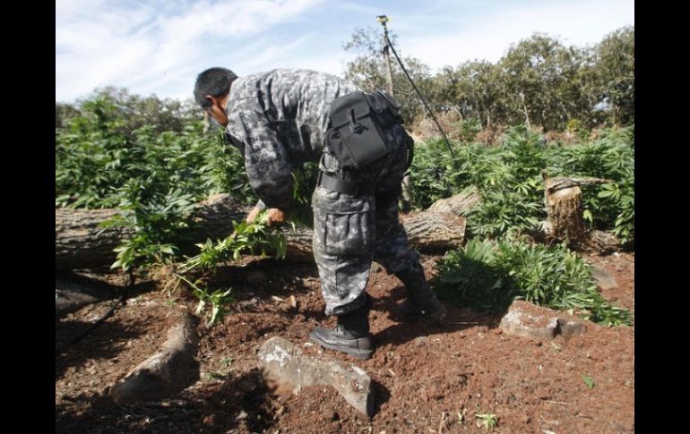 Jalisco | Las siembras ocupaban un área total de unas 66 hectáreas El Ejército destruyó 351 plantíos de mariguana en agosto pasado Además de los plantíos de mariguana fueron sorprendidas 16 personas en acciones delictivas, principalmente relacionadas con la delincuencia organizada Por: EL INFORMADOR 7 de septiembre de 2012 - 11:41 hs Durante el mes de agosto de 2012 Fueron localizados 351 plantíos de mariguana en la Entidad. ARCHIVO / GUADALAJARA, JALISCO (07/SEP/2012).- Durante el mes de agosto de 2012, elementos de la XV Zona Militar informaron que fueron localizados 351 plantíos de mariguana en la Entidad, los cuales estaban sembrados en casi 66 hectáreas, además de dos secaderos desmantelados. Hubo personas detenidas y consignadas ante un fiscal federal. El general de Brigada con Diplomado en Estado Mayor y comandante de la mencionada Zona Militar, informó que además de los plantíos de mariguana fueron sorprendidas 16 personas en acciones delictivas, principalmente relacionadas con la delincuencia organizada. Durante las acciones realizadas por los soldados destaca el aseguramiento de drogas tanto naturales como sintéticas. A detalle Aseguramientos en agosto de 2012 150 kilos, con 65 gramos de crystal. Dos mil kilos 230 gramos de mariguana. 224 gramos de cocaína. 98 pastillas psicotrópicas. 22 dosis de cocaína. 50 kilogramos de semilla de mariguana. 38 armas de fuego largas, entre las que destacan fusiles AR-15 y AK-47. 23 pistolas. Una granada. Dos mil 699 balas de diferentes calibres. 87 cargadores para diferentes armas de fuego. 26 vehículos utilizados para acciones delictivas. Dos mil 527 pesos. 12 dólares americanos. 37 equipos de comunicación utilizados para acciones delictivas. EL INFORMADOR / OMAR RUVALCABA Temas Seguridad Narcotráfico Ejército .Mariguana Recibe las últimas noticias en tu e-mail Todo lo que necesitas saber para comenzar tu día Registrarse implica aceptar los Términos y Condiciones