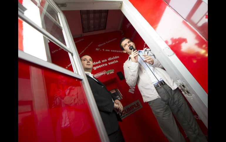 Jalisco | Exponen 30 observaciones que el ex gobernador dejó pendientes en el Estado de México El PAN exhibe en cabina incumplimientos de Peña Al estilo de un cajero automático pintado de color rojo, la coordinación estatal de la campaña de la aspirante a llegar a Los Pinos, Josefina Vázquez Mota, instaló el primer incumplemático a nivel nacional Por: EL INFORMADOR 3 de mayo de 2012 - 13:20 hs La cabina se encuentra ubicada en la casa de campaña de Josefina en Jalisco, frente a la Glorieta Niños Héroes. / GUADALAJARA, JALISCO (03/MAY/2012).- Al estilo de un cajero automático pintado de color rojo, la coordinación estatal de la campaña de la aspirante a llegar a Los Pinos, Josefina Vázquez Mota, instaló el primer "incumplemático" a nivel nacional. A través de esta isla, los panistas de Jalisco, exponen 30 observaciones que el ex gobernador mexiquense, ahora abanderado a la Presidencia de México por el Partido Revolucionario Institucional (PRI), Enrique Peña Nieto, dejó pendiente en aquella entidad. El coordinador estatal de la campaña presidencial del PAN, Diego Monraz Villaseñor, acompañado por el jefe estatal del partido azul, Miguel Monraz Ibarra, inauguraron este espacio. "Con este novedoso sistema de pantalla digital interactiva, la ciudadanía podrá venir a consultar la verdad sobre el Gobierno del Estado de México, de Peña, en donde decenas de promesas quedan aquí, como no cumplidas", comentó Diego Monraz. Entre los señalamientos que exponen los panistas están: cómo el Estado de México se convirtió en líder nacional en secuestros; además, se denuncia que, 33% de los feminicidios de todo el país, se generaron durante el gobierno de Peña Nieto. A la exposición se suma cómo el estado mexiquense llegó al segundo lugar del país con mayor introducción de drogas a las escuelas. "Queremos que exista la madurez y la tolerancia por parte del PRI para que se conozca la verdad, para que la gente sepa que gobierno que no lo quiebran, lo entregan al crimen organizado y ponen en riesgo a las familias de nuestras ciudades", resaltó el coordinador Estatal de la campaña de Josefina Vázquez Mota. Durante 24 horas, la cabina estará abierta para que los jaliscienses puedan ver estos primeros 30 videos. Diego Monraz adelantó, que los videos están ligados a la página web www.peñanocumple.com, por lo que se estará actualizando continuamente la cabina, de acuerdo a las pruebas que el PAN presente de los compromisos no cumplidos. Jalisco, es el pionero a nivel nacional de este sistema y se espera que en los próximos días el modelo comience a replicarse en otras partes del país. PARA SABER El ''incumplemático'' está instalado en la casa de campaña de Josefina Vázquez Mota, que se ubica en la Glorieta Niños Héroes. EL INFORMADOR/MARDIA MENDOZA Temas PAN Enrique Peña Nieto Josefina Vázquez Mota Diego Monraz Elecciones México 2012 Lee También Detienen a presunto autor intelectual del asesinato de líder limonero en Apatzingán Este será el costo del Gas Bienestar en CDMX en la semana del 20 al 25 de octubre Cines de CDMX donde se estrenará Frankenstein de Guillermo del Toro este 23 de octubre Japón enviará ayuda a México para afectados por las lluvias Recibe las últimas noticias en tu e-mail Todo lo que necesitas saber para comenzar tu día Registrarse implica aceptar los Términos y Condiciones