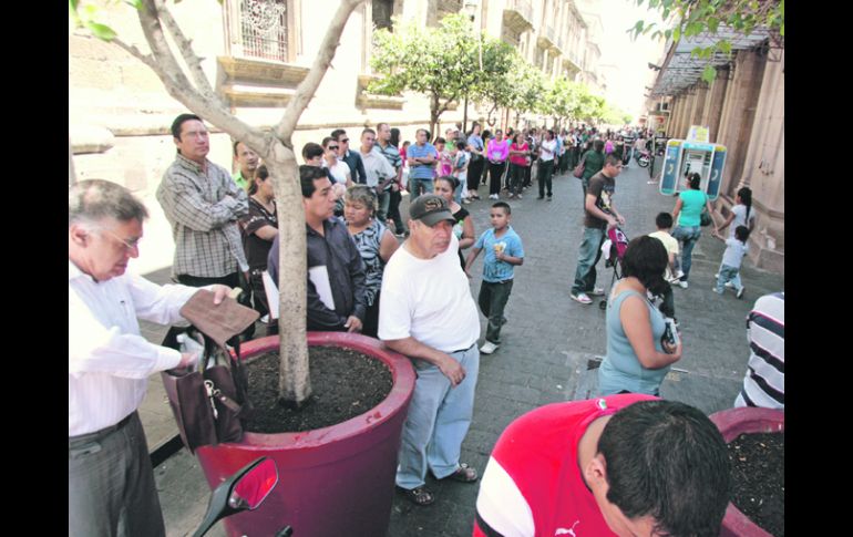 Jalisco | Las recaudadoras registran gran afluencia de personas en su último día de descuentos En el último día, pagan refrendo con descuento Algunos usuarios tuvieron que hacer fila y esperar para poder realizar su pago en el último día que las recaudadoras ofrecían descuentos en el pago del refrendo Por: EL INFORMADOR 2 de abril de 2013 - 03:02 hs Algunos usuarios tuvieron que hacer fila y esperar hasta 30 minutos para poder realizar su pago con descuento. EL INFORMADOR / GUADALAJARA, JALISCO (02/ABR/2013).- Los tapatíos madrugaron para pagar el refrendo ayer, en el último día en que podían aprovechar los descuentos de arranque de año. En la recaudadora 000, de Pedro Moreno y Ramón Corona, en el Centro tapatío, los usuarios hicieron largas filas y algunos esperaron hasta 30 minutos. El usuario Jaime Cuéllar aceptó, por ejemplo, que la culpa no fue de quienes laboran en la recaudadora ni del servicio: “Es de nosotros, por dejar todo para el último”. La que también presentó gran afluencia fue la recaudadora 003, en Circunvalación Oblatos y Artesanos; la gente, ahí sí desesperada, tuvo más quejas por la lentitud del servicio. Temas Gobierno del Estado Refrendo y tenencia Sepaf Lee También Ebrard buscará evitar imposición de aranceles en su visita a EU Así se ve la carretera Guadalajara-Morelia en cámaras del C5 tras bloqueo Gobierno interviene en protesta de maiceros para liberar carreteras "La Mañanera" de Sheinbaum de hoy miércoles 15 de octubre de 2025 Recibe las últimas noticias en tu e-mail Todo lo que necesitas saber para comenzar tu día Registrarse implica aceptar los Términos y Condiciones