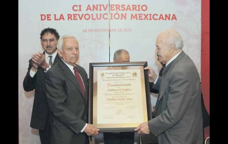 Jalisco | Premian trayectoria de jaliscienses destacados Entregan reconocimiento ''Ciudadano de la República'' Por su servicio a la sociedad, Julio Alejandro Santillán Becerra y Porfirio Cortés Silva fueron galardonados ayer Por: EL INFORMADOR 27 de noviembre de 2011 - 03:26 hs Porfirio Cortés Silva (izquierda) recibió la presea ''Gobernador Guillermo Cosío Vidaurri''. / GUADALAJARA, JALISCO (27/NOV/2011).- La agrupación jalisciense Valentín Gómez Farías otorgó ayer en la Presidencia Municipal de Guadalajara, el reconocimiento “Ciudadano de la República” a dos destacados personajes de Jalisco. La presea “Valentín Gómez Farías” fue entregada al presidente de la Sociedad de Geografía y Estadística de Jalisco, Julio Alejandro Santillán Becerra. La presea “Gobernador Guillermo Cosío Vidaurri”, a Porfirio Cortés Silva, por su larga carrera política, en la que se desempeñó como diputado en el Congreso del Estado en varias legislaturas y fue presidente municipal de Tlaquepaque de 1983 a 1985. El presidente del Comité Ejecutivo de la Agrupación Gómez Farías Guadalajara A.C., Rafael Sánchez Cuevas, manifestó que el reconocimiento “Ciudadano de la República” tiene un carácter de distinción a los ciudadanos que brindan un ejemplo de patriotismo, responsabilidad cívica, compromiso con su comunidad y siempre buscando el bien común. “En el marco del 101 Aniversario de la Revolución Mexicana, reconocemos a hombres y mujeres con la certeza de sus principios y valores que forman un ejemplo en nuestra sociedad”. Temas Premios Municipios Lee También Viernes de tormentas en Guadalajara; aparecerán a esta hora Reconocen a Margarita Aranguren de Alfaro por una vida dedicada al servicio de los demás Entregan la cuarta edición del Premio a la Generosidad Jalisco Pronostican lluvia para Guadalajara este jueves 9 de octubre Recibe las últimas noticias en tu e-mail Todo lo que necesitas saber para comenzar tu día Registrarse implica aceptar los Términos y Condiciones