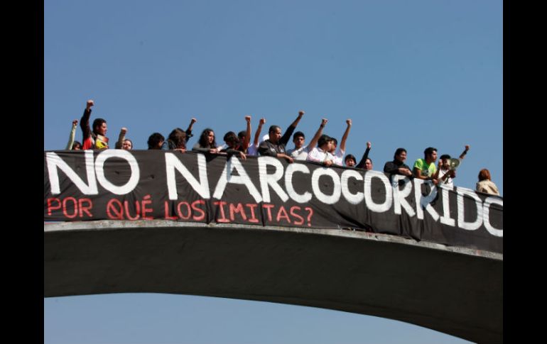 Jalisco | CUCSH Estudiantes colocan mantas contra la violencia Los estudiantes ironizaron la práctica de los delincuentes de colocar narcomantas para transmitir mensajes Por: EL INFORMADOR 5 de febrero de 2011 - 04:23 hs A. GARCÍA / GUADALAJARA, JALISCO (05/FEB/2011).- Sobre el Puente de La Normal, estudiantes del Centro Universitario de Ciencias Sociales y Humanidades ( CUCSH) colocaron un par de mantas para protestar contra la violencia y los elementos que identifican a la cultura del narcotráfico, como los narcocorridos. De esta manera, los estudiantes ironizaron la práctica de los delincuentes de colocar las llamadas narcomantas para transmitir mensajes al Gobierno o a grupos rivales. Temas Manifestaciones en Jalisco Educación local CUCSH Lee También Policía de Zapopan realiza cinco detenciones en una semana Leer y escribir, o la vida universitaria Astros de Jalisco doblega a Xalapa y se pone a un juego de la Final de Zona Escuela Gómez de Mendiola celebra sus primeros 75 años al servicio de los tapatíos Recibe las últimas noticias en tu e-mail Todo lo que necesitas saber para comenzar tu día Registrarse implica aceptar los Términos y Condiciones