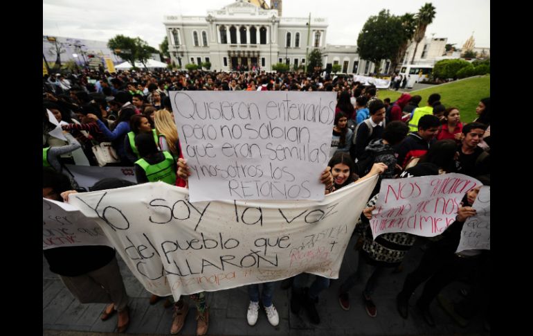 Jalisco | Se manifiestan en varios puntos del Estado para exigir la aparición de los normalistas Estudiantes de Jalisco se manifiestan en apoyo a Ayotzinapa Se manifiestan en varios puntos del Estado para exigir a las autoridades la aparición de los normalistas Por: EL INFORMADOR 5 de noviembre de 2014 - 14:53 hs Estudiantes se manifestaron en apoyo a los 43 normalistas desaparecidos afuera de la rectoría de la UdeG. EL INFORMADOR / J. Mendoza GUADALAJARA, JALISCO (05/NOV/2014).- Diferentes grupos estudiantiles se manifestaron este día para exigir la aparición de los 43 normalistas de Ayotzinapa, Guerrero, cuyo paradero se desconoce desde el 26 de septiembre pasado. Según un reporte de la Policía Vial, un grupo de ocho estudiantes se manifestó pacíficamente a las 09:00 horas frente a Palacio Federal, ubicado en Avenida Alcalde, entre Hospital y Juan Álvarez. A las 10:30, unos 150 maestros y estudiantes protestaron en la autopista Guadalajara-México, a la altura de la caseta de cobro de Ocotlán. A las 11:00, otra vez en Avenida Alcalde, frente al Centro Universitario de Ciencias Sociales y Humanidades (CUCSH) de la Universidad de Guadalajara (UdeG), unos 100 estudiantes se manifestaron para pedir la aparición de los 43 normalistas desaparecidos, interrumpiendo, por 20 minutos, la circulación en la avenida, desde Ávila Camacho hasta Normalistas. El ITESO se unió a las jornadas nacionales por Ayotzinapa. Estudiantes y profesores de diferentes colectivos de esta universidad convocaron al paro activo Jornada de Reflexión #ITESOconAyotzinapa, que comenzó este día a las 10:00 horas y concluirá a las 18:00. Más de 20 actividades integraron el programa. La jornada de reflexión se compuso de cinco ejes temáticos: Espiritualidad, Violencia y ciudadanía, Política y activismo, Compromiso Social del ITESO y Academia y expresión artística. Además, estudiantes de posgrado de la UdeG emitieron un manifiesto en solidaridad con los normalistas de Ayotzinapa. En dicho documento resaltaron que "Ayotzinapa significa la confirmación de que en México las fronteras entre los poderes públicos, políticos profesionales, partidos y crimen organizado no existen o están diluidas". Destacaron que Ayotzinapa es un capítulo más en la larga historia de represiones y masacres que los gobiernos desatan en contra de movimientos populares, juveniles y estudiantiles. "Ayotzinapa se suma a la lista del 2 de octubre, el Halconazo en el Distrito Federal, Aguas Blancas en Guerrero, Acteal en Chiapas y a los hechos de violencia aparentemente irracional como la matanza de San Fernando en Tamaulipas, Salválcar en Ciudad Juárez y muchas más ocurridas en años recientes". EL INFORMADOR / GONZALO JÁUREGUI Temas Educación Manifestaciones en Jalisco UdeG Guerrero ITESO Recibe las últimas noticias en tu e-mail Todo lo que necesitas saber para comenzar tu día Registrarse implica aceptar los Términos y Condiciones