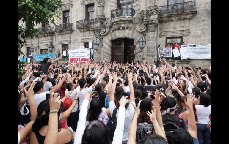 Jalisco | A FONDO: INVESTIGACIONES ESPECIALES Estudiantes de la UdeG regresan a protestar Niegan obligar a los alumnos a asistir, aunque algunos desconocían el motivo de la manifestación Por: EL INFORMADOR 1 de septiembre de 2010 - 04:37 hs Adolescentes de las preparatorias 11, 14 y 16 de la UdeG gritan consignas al unísono contra el gobernador del Estado. A. CAMACHO / VEA LA RUTA DE LA MANIFESTACIÓNESCUCHAR AUDIO DE LA NOTAVER EL VIDEO DE LA MANIFESTACIÓNEntrega de 60 MDP incumple con requisitos legales: PAN La matrícula se contraerá en esta ''danza de los millones'' GUADALAJARA, JALISCO (01/SEP/2010).- Por segundo día consecutivo, estudiantes de las preparatorias de la Universidad de Guadalajara ( UdeG) se manifestaron frente al Palacio de Gobierno, para pedir 390 millones de pesos (MDP) adicionales al presupuesto 2010 de la casa de estudios. De acuerdo con la Secretaría de Vialidad y Transporte (SVyT), fueron más de tres mil alumnos de las “prepas” 11, 14 y 16 quienes participaron en esta protesta, sin que lograran una respuesta del Ejecutivo estatal. Alrededor de las 09:00 horas, el contingente salió de la Fuente Olímpica, ubicada sobre la Calzada Independencia a la altura de la Preparatoria 11, para caminar sobre la calle Juan Álvarez y seguir por Avenida Alcalde hasta la Plaza de Armas. Durante una hora, los jóvenes gritaron consignas en contra del mandatario estatal, Emilio González Márquez, quien se encontraba de gira en Puerto Vallarta para revisar la situación del puente que se desplomó dejando incomunicada a la bahía. Los dirigentes universitarios se mostraron renuentes a establecer diálogo con personal del Gobierno del Estado, pues su exigencia era ser atendidos por el gobernador. Les pone ocho de calificación Respecto a las críticas sobre la pérdida de clases de quienes participan en estas marchas apenas iniciado el ciclo escolar, Roberto López, secretario general del Sindicato de Trabajadores Académicos de la UdeG (STAUdeG), dijo: “Me parece que salir dos, tres o cuatro horas de las clases no es para que se acabe el mundo. No creo que eso sea grave, y lo digo con toda responsabilidad”. Acotó que la movilización les enseña a los adolescentes a defender sus derechos, y hasta calificó el desempeño de los alumnos por la forma en que se llevó a cabo esta manifestación: les puso ocho. Aunque tras un sondeo se constató que había participantes que desconocían el porqué de las protestas, Roberto López aseguró que ningún estudiante fue obligado a asistir. Por otro lado, el presidente de la Federación de Estudiantes Universitarios (FEU), César Barba Delgadillo, contestó a las declaraciones vertidas ayer por el gobernador y lo retó a sentarse para que la Universidad presente un desglose de la forma en que gasta los recursos que posee. Barba Delgadillo adelantó que preparan una “sorpresa” para mañana jueves, cuando se realizará la tercera de las cuatro manifestaciones programadas. Aseguró que en caso de que alguno de los alumnos esté siendo obligado a protestar o reciba sanción por no asistir a las movilizaciones, él actuaría a su favor. SONDEO ¿Crees que las marchas estudiantiles sean la mejor forma de exigir recursos para la UdeG? 18.6% Sí (512). 60.3% No (1659). 21.1% Hay otras opciones (581). *Este sondeo no tiene validez estadística, representa la opinión de dos mil 752 lectores de www.informador.com.mx. Actualizado hasta las 19:35 horas. Temas Educación local UdeG Emilio González A FONDO Lee También Transporte escolar, gran idea y eterna promesa Jóvenes universitarios mostrarán su talento en el Encuentro de las Artes Zapopan 2025 Maestros se rebelan ante programa "La escuela te extraña", acusan aumento de carga laborar SEP: Programa "Tu escuela te extraña" busca regresar a los alumnos a estudiar Recibe las últimas noticias en tu e-mail Todo lo que necesitas saber para comenzar tu día Registrarse implica aceptar los Términos y Condiciones