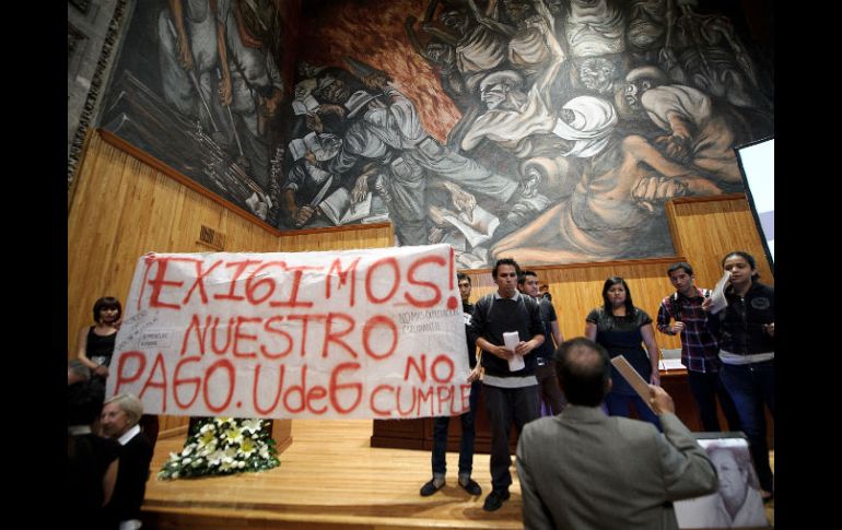 Jalisco | Al término de la ceremonio, unas diez personas exigieron un pago que les adeuda la UdeG Estudiantes se manifiestan en homenaje a Juan Francisco González Al término de la ceremonio unas diez personas exigieron un pago que les adeuda la Universidad de Guadalajara Por: EL INFORMADOR 15 de noviembre de 2012 - 13:10 hs Los estudiantes mostraron una manta, en la que se exponía la leyenda: ''Exigimos nuestros pagos''. / GUADALAJARA, JALISCO (15/NOV/2012).- Al final del homenaje a Juan Francisco González Rodríguez, ex secretario de Cultura del Estado, unos 10 estudiantes de la Universidad de Guadalajara (Udeg) se manifestaron en exigencia de un pago que dicen les adeuda la institución educativa. El hecho tuvo lugar en el Paraninfo de la UdeG. Luego de que Rodríguez González, a quien le reconocieron el impulso cultural que ha dado al Estado, abandonara el estrado junto a otras autoridades de la institución -como el rector Marco Antonio Cortés Guardado y Raúl Padilla-, el grupo de estudiantes subió a éste con una manta en la que se podría leer "Exigimos nuestro pago"; el motivo fue un convenio entre la Secretaría de Seguridad Ciudadana y el Departamento de Sociología para que entre 30 y 35 estudiantes realizaran talleres de intervención sobre violencia escolar en secundaria. Aunque se les prometió a los alumnos que recibirían el pago al final del proyecto, es decir, en julio pasado, éstos afirman que no han recibido un peso. Las cantidades van de los 17 mil 500 hasta los 25 mil pesos. Josué Rosendo, uno de los afectados y quien en el lugar encaró al rector del Centro Universitario de Ciencias Sociales y Humanidades (CUCSH), Pablo Arredondo Ramírez, afirmó que si no cumplen su exigencia continuarán con más manifestaciones. Arredondo Ramírez acordó reunirse mañana a las 10:00 horas con los afectados. EL INFORMADOR / ROBERTO MEDINA Temas Manifestaciones en Jalisco Municipios UdeG Deuda Recibe las últimas noticias en tu e-mail Todo lo que necesitas saber para comenzar tu día Registrarse implica aceptar los Términos y Condiciones
