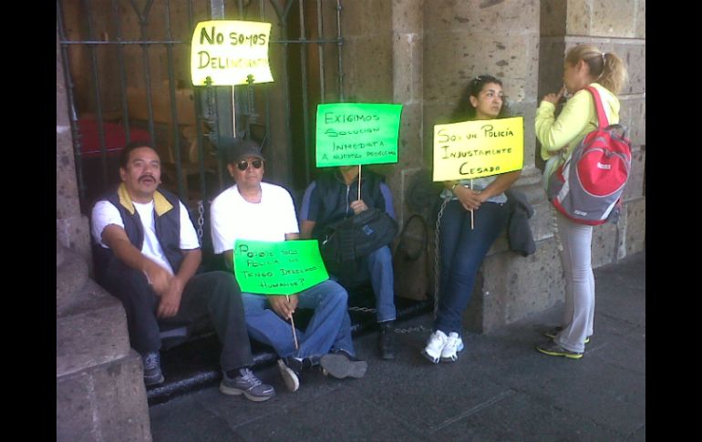 Jalisco | Se encadenan al cancel del pórtico frontal del Palacio Municipal Ex policías de Guadalajara se manifiestan Un grupo de ex policías de Guadalajara se encadenan al cancel del pórtico frontal del Palacio Municipal por inconformidad ante pruebas de control de confianza Por: EL INFORMADOR 29 de abril de 2013 - 09:38 hs Dicen que permaneceran afuera de Palacio hasta que sean escuchados. / GUADALAJARA, JALISCO (29/ABR/2013).- Un grupo de ex oficiales de la Secretaría de Seguridad Ciudadana de Guadalajara que resultaron no aptos con las pruebas de control de confianza, se manifiestan en el Palacio Municipal de Guadalajara para ser atendidos por algún representante del Gobierno municipal. Algunos de estos ex elementos se encadenaron al cancel frontal del pórtico del inmueble, y ahí permanecerán, dijeron, hasta ser escuchados. Además de las inconformidades que sostienen contra los métodos aplicados por el Centro Estatal de Control y Evaluación de Confianza de Jalisco, aseveran que las liquidaciones que ofrece el Ayuntamiento de Guadalajara no se ajustan a derecho. EL INFORMADOR / LUIS HERRERA Temas Seguridad Manifestaciones en Jalisco Certificación policial Lee También Morena Jalisco respalda Reforma Judicial Comienza en Jalisco la Campaña Nacional de Vacunación de invierno Charros de Jalisco buscará frenar su racha negativa en juegos inaugurales de la LMP Autos con estas placas deben realizar la Verificación Vehicular antes del 31 de octubre Recibe las últimas noticias en tu e-mail Todo lo que necesitas saber para comenzar tu día Registrarse implica aceptar los Términos y Condiciones