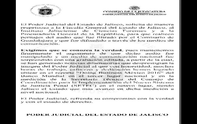 GUADALAJARA, JALISCO (20/OCT/2016).- Dos consejeros de la Judicatura de Jalisco, Irma Leticia Leal Moya y Eduardo Moel Modiano, a través de un comunicado de prensa, emitieron un extrañamiento por la inserción pagada que se publicó en varios diarios locales, donde solicitan a la Fiscalía Estatal y al Instituto Jalisciense de Ciencias Forenses investigar el audio donde se involucra al presidente del Supremo Tribunal de Justicia, Luis Carlos Vega Pámanes, en un presunto acto de abuso de autoridad.La publicación del desplegado sucedió luego de que este martes la asociación Abogando por Jalisco presentó una solicitud de juicio político contra el presidente del Supremo Tribunal de Justicia de Jalisco, Luis Carlos Vega Pámanes.Según el desplegado, el audio donde presuntamente el magistrado pide apoyo para liberar a dos detenidos fue filtrado por el comisario de seguridad de Guadalajara, Salvador Caro, y lo manipularon a fin de difamar el trabajo del Poder Judicial. En el desplegado aparece al Consejo de la Judicatura como firmante.“Desconocemos rotundamente el contenido de dicha inserción pagada, en razón de que el tema ahí expuesto jamás ha sido discutido, y mucho menos se acordó posicionamiento alguno en torno al tema que aduce” señala el comunicado de los consejeros.Además, hicieron un extrañamiento a “quienes utilizan al Poder Judicial para emitir juicios y posicionamientos de tipo político. No es menester de este órgano prejuzgar la actuación de autoridad alguna y mucho menos exigir que se conduzca de manera parcial”. Pidieron que se lleve a cabo una investigación de los hechos apegada a derecho.El alcalde de Guadalajara, Enrique Alfaro, por la mañana desestimó el mismo desplegado y afirmó que había varios consejeros de la Judicatura que no estaban de acuerdo con su publicación.“Que investiguen, nosotros queremos eso. Que los pillos que están metidos en el Poder Judicial y que tratan de defenderse como pueden acaben en la cárcel. El que nada debe, nada teme”, indicó Alfaro.