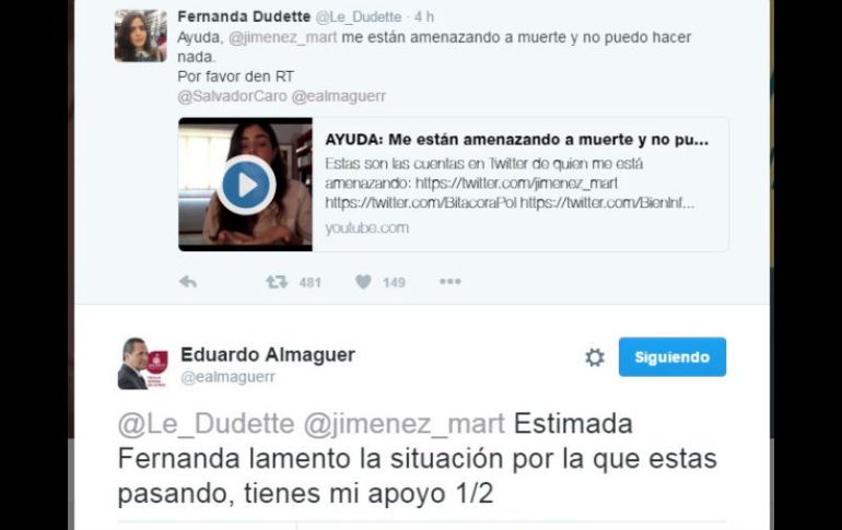 GUADALAJARA, JALISCO (16/NOV/2016).- El fiscal general de Jalisco, Eduardo Almaguer, aseguró hoy a una videobloguera tapatía que la dependencia investigará sus denuncias acerca de un hombre que la acosa y la ha amenazado de muerte por sus publicaciones en redes sociales. La afectada es Fernanda Dudette, que durante este miércoles publicó en sus cuentas de Facebook y Twitter su reclamo de ayuda dirigido al jefe de Policía de Guadalajara, Salvador Caro, y al fiscal Eduardo Almaguer. La mujer afirma que el hombre, que la ha acosado en anteriores ocasiones y golpeó a un conocido suyo, volvió a amenazarla con que la golpearía e incluso haría que la "levanten" y la violen. En el video y en las publicaciones identifica al agresor con el nombre de Alberto Jiménez Martínez y con sus respectivas cuentas de redes sociales al hombre que acusa, al que señala como un "golpeador" que la agredía desde que, en las elecciones de 2015, ella apoyó al hoy diputado independiente Pedro Kumamoto. Pero la principal queja de la afectada en su video es que, aunque en la primera ocasión en que señaló al supuesto acosador éste fue arrestado, "no he podido meter una denuncia, aunque lo intenté, porque no me habían golpeado". La quejosa subraya que, como ocurre a otras mujeres que sufren acoso pero no violencia física, eso la deja desprotegida, porque "hasta que no me golpeen" no podrá esperar apoyo de la autoridad. Con esa queja principal, Fernanda comenzó a publicar quejas y a solicitar ayuda en sus redes sociales, y finalmente esta tarde el fiscal respondió por Twitter con dos mensajes: "Lamento la situación por la que estás pasando, tienes mi apoyo; he instruido a personal de @FiscaliaJal para investigar las agresiones y amenazas que has recibido". En las mismas redes sociales donde Fernanda Dudette publicó sus denuncias, otras personas secundan las acusaciones contra el señalado y lo señalan como responsable de otros casos de acoso. Además hay usuarios que dirigen las quejas de la bloguera hacia dependencias como el Instituto de la Mujer de Guadalajara, para subrayar el caso como un ejemplo de violencia de género en el estado. En la cuenta de Twitter @jimenez_mart, el acusado, por su cuenta, niega las acusaciones y rechaza que haya un antecedente penal de agresiones contra la videobloguera. Sin embargo, en esas mismas publicaciones otros usuarios publicaron videos con las noticias de televisión en donde se narran los sucesos recordados por Fernanda Dudette.