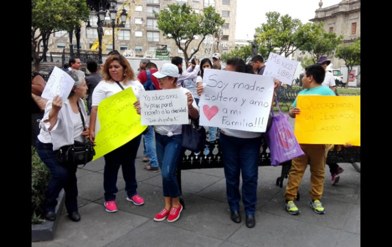 GUADALAJARA, JALISCO (10/SEP/2016).- Vestidos de negro y portando banderas con los colores del arcoiris, alrededor de 20 personas, entre hombres, mujeres y niños, se manifestaron este sábado afuera de Palacio de Gobierno, para exigir que se respeten los derechos humanos y entregar un pliego petitorio. "Estamos haciendo una manifestación simbólica por el Estado laico. En el pliego estamos pidiendo al Gobierno de Jalisco que ellos intervengan, no estamos en contra de la marcha que van a hacer, simplemente no estamos de acuerdo con los discursos que atentan contra los derechos de la población LGBT del Estado", comentó Carlos Becerra, secretario de Unión Diversa de Jalisco. La manifestación comenzó a las 11:00 de la mañana y fueron recibidos en el recinto por Juan Carlos Benítez, representante del Consejo para Prevenir y Eliminar la Discriminación en el Estado de Jalisco, quien se comprometió a abrir una mesa de diálogo con el Frente Pro Diversidad. "La próxima semana comenzaremos a trabajar. El matrimonio igualitario ya es un hecho legal, pero en algunos registros civiles no están permitiendo casar, entonces vamos a hacerle llegar al Gobierno del Estado en qué municipios no están trabajando", dijo Becerra. Por otro lado, señaló que en los últimos 10 días han recibido amenazas, por lo que ya se han acercado a la Fiscalía General de Jalisco. "Hemos recibido correos electrónicos con amenazas de muerte y nos han hackeado cuentas. Hasta el momento somos cuatro los afectados y ya estamos haciendo el trámite para levantar las denuncias". Para finalizar, integrantes del Frente Pro Diversidad, que integra a 25 organizaciones civiles, hicieron un llamado a no acudir a la marcha que realizará el Frente Nacional por la Familia este sábado a las 17:00 horas y se deslindaron de cualquier acto de violencia.Además, invitaron a la “pedaleada” que se llevará a cabo este domingo a las 11:00 horas, saliendo de la calle Madero, en el cruce con Avenida Federalismo. En este mismo sentido, se está citando a las 17:00 horas a participar en la marcha a favor de la aprobación del matrimonio igualitario y la ley de identidad sexogenérica, la cual iniciará en la avenida Hidalgo en su cruce con avenida Chapultepec EL INFORMADOR / ELIZABETH MONDRAGÓN
