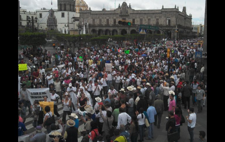 Jalisco | Estudiarán las bases jurídicas de las exigencias del magisterio disidente Gobierno estatal y maestros se reunirán el miércoles Según la Unidad Estatal de Protección Civil y Bomberos, hoy se manifiestan cuatro mil personas; los inconformes dicen que son 28 mil Por: EL INFORMADOR 21 de septiembre de 2013 - 13:43 hs En este momento, la protesta bloquea la Avenida 16 de Septiembre, Juárez e Hidalgo. Aún no hay hora definida para que se retiren. / GUADALAJARA, JALISCO (21/SEP/2013).- Tercer sábado consecutivo de marchas. Todas, por la misma razón: el rechazo de un sector de los maestros de Jalisco contra la reforma educativa. Alrededor de las dos de la tarde, mientras los manifestantes mantenían bloqueada la Avenida 16 de septiembre, entre Juárez e Hidalgo (vías que también se vieron afectadas), cerca de 20 maestros entraron a Palacio de Gobierno para entregarle un pliego petitorio a Arturo Zamora, secretario general de Gobierno. De ese encuentro salió el acuerdo para que el próximo miércoles, la autoridad estatal y los docentes se reúnan para discutir las bases jurídicas de sus exigencias, entre las que se encuentra que el Ejecutivo local interponga una controversia constitucional contra la reforma educativa. Arturo Zamora contó: "El documento contiene varias peticiones, gran parte será turnada al secretario de Educación (Francisco Ayón) porque tienen que ver con temas pedagógicos fundamentalmente". Los maestros que se quedaron en la Avenida 16 de Septiembre mientras sus compañeros estaban en el recinto estatal, acordaron hacer paro de labores el próximo miércoles. Cada quien usa sus cifras. Mientras la Unidad Estatal de Protección Civil y Bomberos de Jalisco afirma que marcharon cuatro mil inconformes, los maestros mencionan que fueron 28 mil. La marcha partió desde La Normal después de las 09:00 horas. Las consignas no variaron en comparación con las pasadas protestas: "¡Si Peña, pudiera, a su madre la vendiera!"; "¡Si Peña, reprueba, también se queda fuera!"; "¡El maestro, luchando, también está enseñando!"; "Oaxaca, aguanta, Jalisco se levanta"; "¡Prensa vendida, cuéntanos bien, no somos uno, no somos 100!", entre otras. Los agentes de la Policía Vial evitaron el paso sobre la avenida conforme fue avanzando la protesta. Sólo los carros que querían cruzar Alcalde podían pasar y los mismos maestros daban oportunidad de que lo hicieran. El mitin realizado a la altura de Palacio de Gobierno se dio por finalizado alrededor de las 14:45 horas, pero los inconformes tardaron alrededor de media hora en despejar la Avenida 16 de Septiembre. Minutos antes de esto, en Hidalgo y Juárez ya se circulaba con normalidad. Temas Manifestaciones en Jalisco Municipios Reforma Educativa Arturo Zamora Recibe las últimas noticias en tu e-mail Todo lo que necesitas saber para comenzar tu día Registrarse implica aceptar los Términos y Condiciones