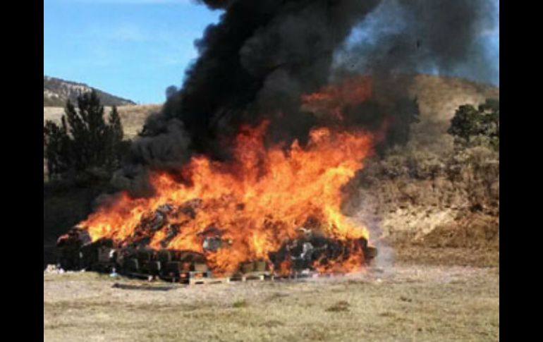 Jalisco | La PGR informa que la destrucción incluyó mariguana, cocaína, hachís y heroína Incineran más de cuatro toneladas de drogas decomisadas en Jalisco La PGR informa que la destrucción incluyó mariguana, cocaína, hachís y heroína, entre otras Por: NTX 20 de febrero de 2015 - 18:51 hs El acto se efectuó en el Club Cinegético de la Venta del Astillero. ESPECIAL / pgr.gob.mx ZAPOPAN, JALISCO (20/FEB/2015).- La Procuraduría General de la República ( PGR) incineró en Zapopan, Jalisco, más de cuatro toneladas de estupefacientes decomisados en operativos realizados por instituciones de seguridad de las tres instancias de gobierno. En un comunicado informó que con esta acción se dio cumplimiento a lo establecido en el Programa de Destrucción de Narcóticos y lo dispuesto por el Artículo 181 del Código de Procedimientos Penales, que prevé la destrucción de la droga asegurada. El acto se efectuó en el Club Cinegético de la Venta del Astillero y estuvieron presentes elementos de la Policía Federal Ministerial y personal del Órgano Interno de Control de la PGR, quien dio fe de la autenticidad y peso de los estupefacientes incinerados. La destrucción incluyó cuatro toneladas 752 kilos 753 gramos de mariguana, 51 kilos 79 gramos 600 miligramos de plantas de mariguana, un kilo 165 gramos de cocaína, 12 gramos 800 miligramos de hachís y 254 gramos 200 miligramos de heroína. Además seis kilos 310 gramos de mezcalina, 12 kilos 143 gramos de metanfetamina, 74 unidades de metanfetamina, 82 litros 760 mililitros de metanfetamina líquida, un kilo 367 gramos de opio y un kilo 720 gramos de plantas de amapola. También se destruyeron mil 106 unidades de psicotrópicos, tres kilos 982 gramos de semilla de amapola, 16 kilos 774 gramos de semilla de mariguana y dos mil 193 unidades de Taladofil. Temas Seguridad PGR Decomisos de droga en Jalisco Drogas Mariguana Recibe las últimas noticias en tu e-mail Todo lo que necesitas saber para comenzar tu día Registrarse implica aceptar los Términos y Condiciones