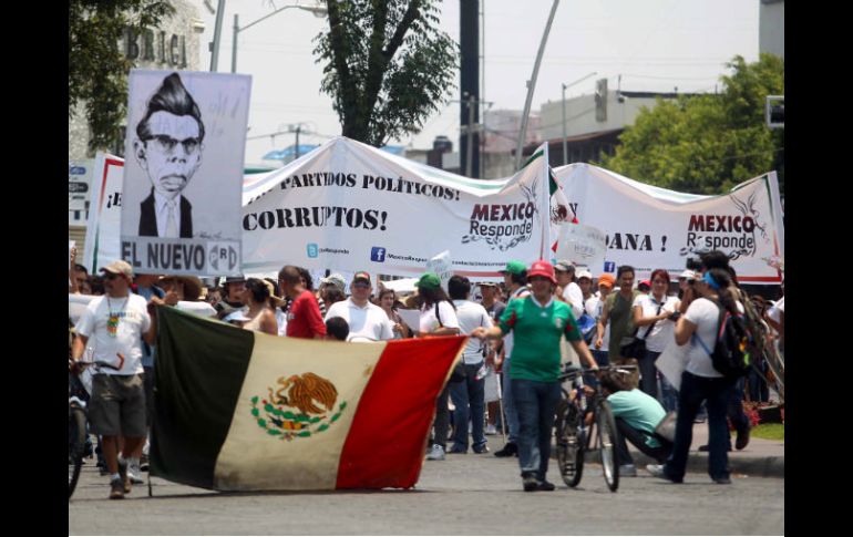Jalisco | #YoSoy132 se dirige al parque Las Estrellas, para debate presidencial Jóvenes tapatíos ''despiertan'' en el Parque Rojo Contingente de más de mil jóvenes arribaron al Parque Revolución desde Arcos Vallarta, lanzaron gritos contra Enrique Peña Nieto y Aristóteles Sandoval Por: EL INFORMADOR 10 de junio de 2012 - 16:26 hs Estampa de la manifestación de #YoSoy132 en Avenida Vallarta. / GUADALAJARA, JALISCO (10/JUN/2012) - Más de mil jóvenes pertenecientes al movimiento #YoSoy132, así como ciudadanos que se adhirieron en el camino, llegaron en un contingente al Parque Revolución y tomaron los cuatro carriles de Avenida Vallarta a esa altura para entonar el himno nacional a ojos cerrados y, al terminar, arrancarse las vendas en signo de que están despiertos ante la realidad política del país. "Somos analíticos y estamos contra la manipulación de los medios masivos de comunicación. Hoy estamos aquí por el hecho de que tú y yo debemos estar informados", aseguró un joven desde la bocina. "La democracia no es estar con los ojos cerrados, la democracia es la claridad para poder ver los problemas de nuestro país". Durante su andanza desde los Arcos Vallarta hasta este punto, los manifestantes lanzaron consignas contra los candidatos Enrique Peña Nieto y Aristóteles Sandoval, así como contra el partido que los abandera, el Revolucionario Institucional. A su paso, eran entregados trípticos y volantes con información del ex gobernador de México sobre los resultados "deficientes" de su gestión, que lo catalogan como "un peligro para México" y "asesino", por los campesinos muertos en el caso Atenco. Sin embargo, el objetivo que motivó la marcha fue invitar a los ciudadanos a ver el debate, cuando las consignas que lanzan son contra la supuesta manipulación de información que realiza TvAzteca y Televisa en favor del priista. Antes de la puesta en marcha de la segunda parte de la manifestación, los jóvenes y adultos descansaron en el Parque Rojo y escucharon a un grupo musical como parte de las actividades programadas por los organizadores. El destino final es el Parque de las Estrellas, donde habrán de dispersarse antes de que comience el debate presidencial. EL INFORMADOR / VIOLETA MELÉNDEZ Temas Debates políticos Elecciones México 2012 Elecciones Jalisco 2012 #YoSoy132 Recibe las últimas noticias en tu e-mail Todo lo que necesitas saber para comenzar tu día Registrarse implica aceptar los Términos y Condiciones