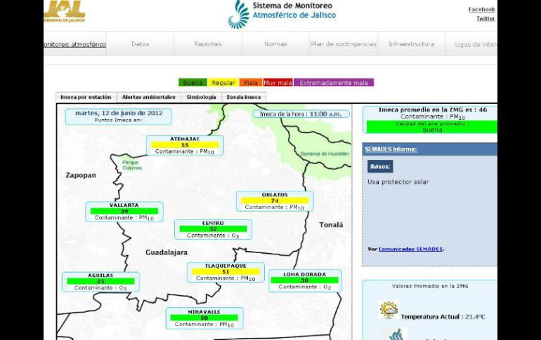 Jalisco | El micrositio dará a conocer el Plan de Emergencias Atmosféricas de la ZMG La Semades estrena portal para monitoreo atmosférico El nuevo portal concentra información que anteriormente se encontraba en distintas secciones de la página oficial de la dependencia Por: EL INFORMADOR 12 de junio de 2012 - 10:19 hs Se estarán dando a conocer los datos de lo que ocurriendo cada hora sobre las condiciones ambientales de la ZMG. ESPECIAL / GUADALAJARA, JALISCO (12/JUN/2012).- Con el objetivo de dar respuesta a las necesidades de contar con un instrumento que muestre a la población los niveles en la calidad del aire en la Zona Metropolitana de Guadalajara (ZMG), de manera preventiva, la Secretaría de Medio Ambiente para el Desarrollo Sustentable (Semades) pone en marcha el portal del Sistema de Monitoreo Atmosférico de Jalisco (Simaj). El sitio en la red, concentra información que anteriormente se encontraba en distintas secciones de la página oficial de la dependencia, tales como: reportes de calidad del aire, normas datos históricos, plan de contingencia atmosférica. Además ofrece al usuario acceso a documentos que antes debían ser solicitados vía transparencia. El titular de la Secretaría, Héctor Eduardo Gómez Hernández indicó que “este sitio contiene un nuevo mapa que incluye todas las estaciones de una manera más clara y fácil de entender, también muestra información meteorológica como humedad, temperatura y radiación solar”. Gómez Hernández señaló que a través del micrositio se dará a conocer el Plan de Emergencias Atmosféricas con el que se actuará de manera preventiva mediante alertas en la ZMG y el interior del Estado, el cual se activará en base a las concentraciones puntuales de contaminantes criterio como PM10 y los niveles se darán a conocer a través de un termómetro en el sitio antes mencionado. El funcionario agregó que se estarán dando a conocer los datos de lo que está ocurriendo cada hora con los tres gases criterio PM10, Ácidos de Azufre y Monóxido de Carbono. Novedades del sitio - Es compatible con todos los navegadores - Ofrece al usuario acceso a información que antes se solicitaba vía transparencia - Cuenta con un mejor sistema de adquisición de datos - La sección de avisos es administrada por personal de la RAMAG - Vincula con Facebook y Twitter Dato Cabe recalcar que el Plan de Emergencias Ambientales es con fines preventivos y no sustituye al Plan de Contingencias Atmosféricas, el cual mantiene el esquema de activación de la contingencia atmosférica por promedio a nivel ZMG. Temas Semades Municipios Contaminación ambiental en Jalisco Lee También Cartucho Astros de Jalisco toma ventaja sobre Xalapa en la semifinal de zona Detienen a presunto homicida en Lomas de Oblatos Puerto Vallarta es reconocida como la mejor ciudad pequeña de Latinoamérica Recibe las últimas noticias en tu e-mail Todo lo que necesitas saber para comenzar tu día Registrarse implica aceptar los Términos y Condiciones