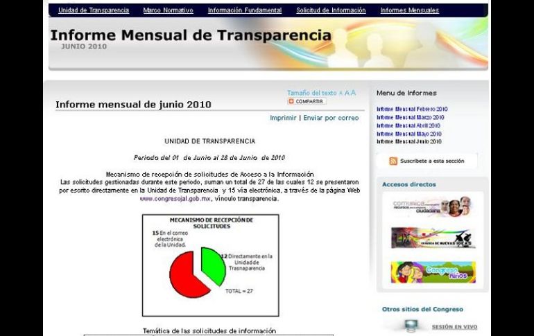 Jalisco | Analizan adelantar revisión de sitios web oficiales La página de internet del Congreso tiene deficiencias: Itei El titular del organismo en materia de transparencia señala que el sitio es lento y complejo Por: EL INFORMADOR 7 de julio de 2010 - 05:19 hs Para el siguiente año está programada la revisión del Itei a la página web del Congreso, junto con las de los municipios. ESPECIAL / GUADALAJARA, JALISCO (07/JULIO/2010).- La página de internet del Poder Legislativo tiene deficiencias para ser consultada, consideró el presidente del Instituto de Transparencia e Información Pública ( Itei), Jorge Gutiérrez Reynaga. Dijo que su uso es complejo, además de que el sistema es lento, por lo que exhortó a los diputados a mejorarla. Recomendó que “cambien de analista de sistemas porque es algo muy sencillo y tan simple como subir la información que tienen escaneada, y que en su momento debieron otorgar a la Auditoría Superior del Estado de Jalisco ( ASEJ). He intentando buscar información en el Congreso, pero la página es lenta”. Gutiérrez Reynaga dijo que de acuerdo con el calendario del Itei, tocaría hasta 2011 una revisión puntual de los sitios oficiales del Poder Legislativo y de los municipios, pues ahora se trabaja en la revisión de las páginas de los Organismos Públicos Descentralizados (OPD). No obstante, reconoció que autoridades de la Zona Metropolitana de Guadalajara (ZMG) le han solicitado una evaluación de sus páginas, por lo que se podría adelantar la revisión antes de que concluya este año. “De manera verbal los presidentes municipales de la ZMG me han solicitado que revisemos sus páginas de internet, lo analizamos. Si pudiéramos reprogramarlo y con los ahorros que hemos generado, buscaremos la manera de evaluar las páginas de los sujetos obligados y no esperarnos hasta el año próximo”. Esperan respuesta de la Procuraduría Hace una semana, Gutiérrez Reynaga envió un oficio al procurador general de Justicia del Estado, Tomás Coronado Olmos, exhortándolo a realizar mesas de trabajo conjuntas para conocer los motivos por los que las denuncias penales que interpone el Itei en contra de sujetos obligados que no entregan información no proceden. El primer fiscal no ha respondido a esta petición. “Al día de hoy no he recibido respuesta a la petición que hicimos hace más de una semana. Mi trabajo es coadyuvar con el trabajo que hace el Ministerio Público. No he tenido respuesta, el diálogo no fluye; por mi parte estoy dispuesto”, explicó el titular del Itei. Gutiérrez Reynaga consideró que para que este tema avance, se debe modificar la manera en que se elige al primer fiscal del Estado, “siempre he dicho que el procurador debe tener autonomía”. Finanzas omite entregar información de la Vía Express El Itei dio cuenta de la inconformidad de un ciudadano que solicitó a la Secretaría de Finanzas (Sefin) información relativa al proyecto denominado Vía Express, a lo que la dependencia estatal no respondió. El presidente del organismo en materia de transparencia dijo que se solicita, entre otras cosas, los estudios de factibilidad, copia del proyecto ejecutivo, estudios técnicos, levantamiento de topografía, estudios de impacto ambiental y de imagen urbana, y copia de los planes parciales de acuerdo con el Código Urbano. Gutiérrez Reynaga dijo que si el Poder Ejecutivo no cuenta con esos documentos, debe informarle al solicitante y explicarle en qué proceso se encuentra el proyecto. “Pero los documentos con los que cuenta el Gobierno deben entregarse. (El Ejecutivo) Debe tener un cronograma y ruta crítica en la que informe en qué etapa está (el proyecto) e informarle al particular cuál es la etapa y documentación que tiene”. Se prevé que la próxima semana el pleno del Consejo del Itei se pronuncie en torno a este tema, una vez que se analice la solicitud de información. Temas Congreso local Itei Jorge Gutiérrez Reynaga Lee También Harfuch y los medios Cartucho Portada: Dr. José Magaña, embajador de Arkana México Diputados responden a Lemus sobre diálogo por la Reforma Judicial Recibe las últimas noticias en tu e-mail Todo lo que necesitas saber para comenzar tu día Registrarse implica aceptar los Términos y Condiciones