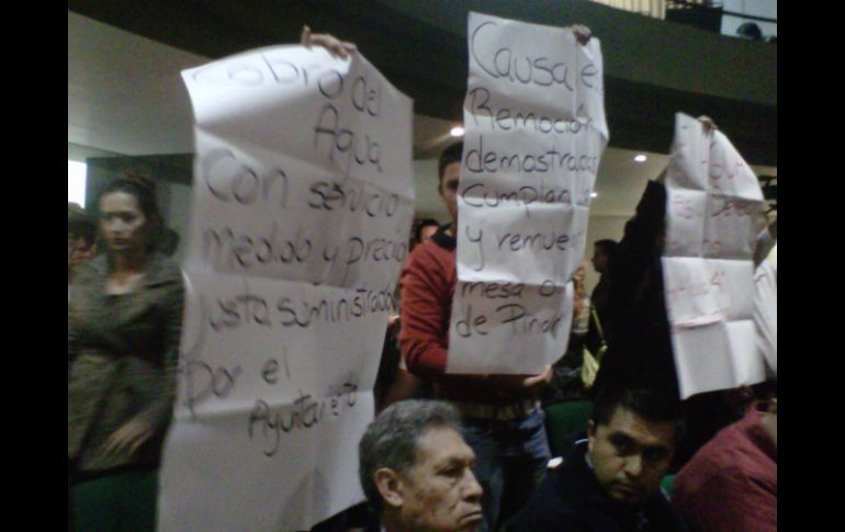 Jalisco | Colonos, policías reprobados y ejidatarios interrumpieron la asamblea del municipio Llegan manifestantes a sesión de Ayuntamiento de Zapopan Colonos, policías reprobados y ejidatarios se manifestaron en la sala del Ayuntamiento de Zapopan con el objetivo de presentar sus quejas ante el alcalde Héctor Robles Por: EL INFORMADOR 31 de enero de 2013 - 10:38 hs Los habitantes de Pinar de la Venta piden agua potable en su colonia. / ZAPOPAN, JALISCO (31/ENE/2013).- Vecinos de Pinar de la Venta, ejidatarios de Santa Ana Tepetitlány un grupo de policías permanecieron de manera pacífica en la sala de sesiones del Ayuntamiento de Zapopan, para hacer visibles sus problemáticas. Al menos 12 personas sostuvieron carteles durante la sesión ordinaria de este jueves, a fin de pedir que la administración de Héctor Robles Peiro regule y "preste" el servicio de agua potable en Pinar de la Venta. El alcalde dio cuenta de la presencia de los manifestantes e indicó que la Dirección de Atención Ciudadana se acercaría con los vecinos para concertar una reunión con ellos y que sean escuchados. Alejandro Cárdenas Ochoa, representante del Parlamento de Colonias, acusó en entrevista que la Directiva de la Asociación Vecinal de Pinar de la Venta, presidida por Karina Motta, ha hecho cortes de agua y cobrado cuotas "sin sustento legal ni técnico". Pide que el municipio reciba los pagos del servicio de agua "con una tarifa apegada a la ley". Asimismo, a la sala de ayuntamiento acudieron policías inconformes con el procedimiento de las pruebas de control de confianza, para enterarse de un posible acuerdo de contratación de elementos de seguridad pública, según dijo uno de los presentes. En ese sentido, el alcalde Héctor Robles Peiro declaró posteriormente que los elementos reprobados que estén en posibilidad de jubilación dentro del periodo de su administración serán recontratados en un espacio administrativo del mismo nivel, "con el compromiso de que se llegue a la jubilación durante el periodo de gobierno o al término del mismo". El munícipe no especificó la cantidad de elementos que estarían en ese supuesto, pero aseveró que más del 65% de los reprobados (en total son 389) tiene 10 años de antigüedad. Además, Teodoro Rivera Rodríguez, del ejido de Santa Ana Tepetitlán, permaneció en la sesión de ayuntamiento y expuso a representantes de medios que están despojando de tierras a unos 10 ejidatarios; serían 20 hectáreas las disputadas. EL INFORMADOR / MIRIAM PADILLA Temas Manifestaciones en Jalisco Municipios Héctor Robles Zapopan Lee También Así se ve la carretera Guadalajara-Morelia en cámaras del C5 tras bloqueo SAT: ¿Cómo saber si hay servicio tras el paro de trabajadores? ¿Quién es el líder del cártel del "Mencho" que cayó en Guadalajara? Interviene el Gobierno del Estado en protesta de maiceros para liberar carreteras Recibe las últimas noticias en tu e-mail Todo lo que necesitas saber para comenzar tu día Registrarse implica aceptar los Términos y Condiciones