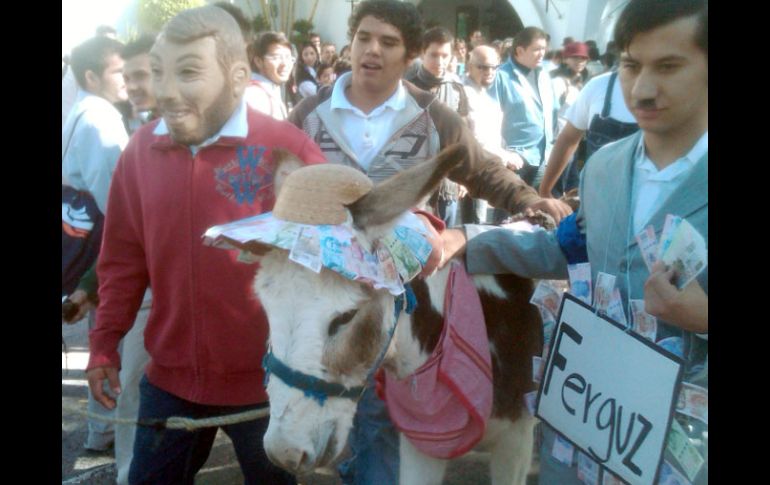 Jalisco | Estudiantes de la UdeG trasladaron al animal a las afueras de Casa Jalisco Llevan burro a Emilio Estudiantes de la UdeG trasladaron al animal a las afueras de Casa Jalisco, en signo de protesta por la falta en la entrega de recursos Por: EL INFORMADOR 9 de diciembre de 2010 - 11:01 hs Estudiantes que acompañaron la protesta no perdieron la oportunidad de tomarse una foto con el burro. R. ZAPATA / GUADALAJARA, JALISCO (09/DIC/2010).- A forma de protesta, alumnos y profesores de la Universidad de Guadalajara (UdeG) llevaron un burro a Casa Jalisco para exigir al titular del Ejecutivo estatal, Emilio González Márquez, entregue los 701 millones de pesos que adeuda la Entidad por compromisos adquiridos con la Federación desde el 2007. La manifestación, a la que acudieron alrededor de 500 udegeístas fue liderada por el presidente de la Federación de Estudiantes Universitarios (FEU), Marco Antonio Núñez Becerra, quien dijo que la idea de llevar el burro al recinto de Manuel Acuña responde a una más de las acciones de la “resistencia civil pacífica” en torno a la cual se seguirán suscitando movilizaciones que irán acompañadas del factor sorpresa. Este burro es el primer animal que participa en las movilizaciones de la UdeG. Fue trasladado hasta el despacho del gobernador en un remolque para caballos. Estaba adornado con un sombrero, mascada y billetes de juguete, y era acompañado por un estudiante vestido como el dictador alemán Adolfo Hitler quien portaba una cartulina con la leyenda “Ferguz”, en alusión al secretario general de Gobierno, Fernando Guzmán Pérez Peláez. Muchos de los estudiantes pertenecientes a los centros universitarios de Arte Arquitectura y Diseño; de Ciencias de la Salud; de Ciencias Económico Administrativas; y de la Preparatoria 1 que participaron la protesta, no perdieron la oportunidad de tomarse una foto con el burro que resultaba muy simpático para los manifestantes. La de hoy miércoles es la cuarta movilización que se lleva al cabo en la segunda etapa de protestas, y se realiza luego de la visita que ocho rectores de distintas universidades públicas del país, entre ellos el de la UNAM, José Narro Robles, hicieran a la ciudad para exigir al mandatario estatal la entrega de los recursos que adeuda a la UdeG y expresar su total apoyo en el conflicto presupuestario que la casa de estudios libra con el Gobierno del Estado desde principios de año. EL INFORMADOR / RAFAEL ZAPATA Temas Manifestaciones en Jalisco Gobierno del Estado Emilio González Presupuesto UdeG Recibe las últimas noticias en tu e-mail Todo lo que necesitas saber para comenzar tu día Registrarse implica aceptar los Términos y Condiciones