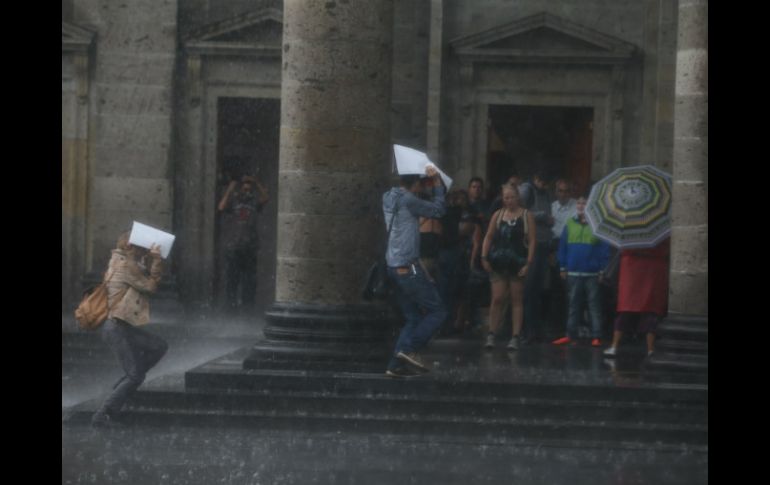 GUADALAJARA, JALISCO (11/AGO/2016).- Una fuerte lluvia que comenzó alrededor de las 13:00 horas sorprendió a los paseantes del Centro Histórico de Guadalajara.Hombres y mujeres resguardándose de la lluvia, bajo techos de negocios y edificios ha sido la imagen constante de esta tarde en el primer cuadro de la ciudad.La Dirección de Protección Civil y Bomberos Guadalajara recomendó a los ciudadanos no resguardarse bajo los árboles, al mismo tiempo que aseguró que la lluvia se presentó en varios puntos de la ciudad.Por su parte, el Ayuntamiento de Guadalajara reportó una lluvia de moderada a fuerte y pidió a los internautas a evitar Jardines del Bosque, Plaza del Sol, Lázaro Cárdenas y Cruz del Sur.La autoridad tapatía compartió imágenes, a través de su cuenta de Twitter, de Lázaro Cárdenas debajo de los Arcos del Milenio que, una vez más, se inundó y tuvieron que cerrar a la circulación mientras personal de servicios municipales trabaja en el área.Luego de las 14:00 horas, aproximadamente, la lluvia cesó. El Radar Meteorológico Doppler, de la Universidad de Guadalajara arrojaba datos sobre persistencia de ecos de lluvia moderada a fuerte en la zonas de Oblatos, Tetlán y el municipio de Zapopan.