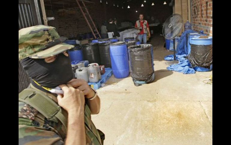Jalisco | Se detuvieron a tres y se les aseguró droga Localizan laboratorio clandestino para elaborar droga en Zapopan Se detuvieron a tres personas y se les aseguró droga Por: NTX 6 de noviembre de 2010 - 10:15 hs Se decomisaron tres tinas con capacidad de 200 litros, tenían aproximadamente 50 kilogramos de sustancia cristalina fase. ARCHIVO / ZAPOPAN, JALISCO (06/NOV/2010).- La Secretaría de la Defensa Nacional ( Sedena), por conducto de la XV Zona Militar, informó de la localización de un laboratorio clandestino para la elaboración de droga sintética, donde se detuvo a tres personas y se aseguró droga. Indicó que en el marco de la campaña permanente en contra del narcotráfico, personal militar atendió una denuncia ciudadana y se trasladó al ejido "Los pueblitos", en este municipio, donde se logró detener a tres sujetos en un laboratorio para elaboración de droga. Los detenidos son Gerardo Espinoza García, de 38 años de edad; Guillermo Bedoya García, de 32, y Miguel Angel Bedoya García, de 18 años. También se decomisaron tres tinas de plástico con capacidad de 200 litros cada una, conteniendo en su interior aproximadamente 50 kilogramos de sustancia cristalina fase (AFA), así como dos cubetas con 30 kilogramos de una sustancia cristalina al parecer cristal. Asimismo, 48 costales de sosa cáustica, 24 costales de acetato de sodio, cuatro coladores, una caldera con capacidad de 750 litros, una caldera con capacidad de 200 litros, dos cedazos; un rollo de manguera, tres termómetros, dos tinas de plástico, dos cilindros de gas y dos quemadores. También una mesa de madera, tres mascarillas, dos vaporeras, 20 cubetas de plástico, un tinaco de plástico con capacidad de mil litros, una vaporera con capacidad de 10 litros y dos vaporeras con capacidad de 40 litros con residuos de cristal. Temas Seguridad Decomisos de droga en Jalisco Narcolaboratorio Lee También Policías de Tlaquepaque aseguran contenedores con carga millonaria Lluvia caerá en Guadalajara; ¿afectará tormenta "Raymond"? Abogado de presunta víctima espera vinculación a proceso de Omar "N" Así luce Cihuatlán ante el paso de la tormenta tropical "Raymond" (VIDEO) Recibe las últimas noticias en tu e-mail Todo lo que necesitas saber para comenzar tu día Registrarse implica aceptar los Términos y Condiciones