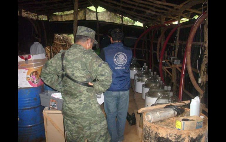 Jalisco | Además, en diversos operativos, militares aseguraron drogas, vehículos y armas Localizan siete narcolaboratorios en el sureste jalisciense Además, en diversos operativos, militares aseguraron drogas, vehículos, armas y artículos diversos Por: NTX 30 de mayo de 2011 - 13:29 hs Militares aseguraron dos hornos metálicos con capacidad de 500 litros. ARCHIVO / ZAPOPAN, JALISCO (30/MAY/2011).- La Décimo Quinta Zona Militar informó hoy que del 19 al 29 de mayo, personal militar realizó operaciones en la región sur del estado y localizó siete laboratorios clandestinos para elaborar drogas y decomisó diversas armas de fuego, así como estupefacientes. Indicó que en el sureste del estado se detuvo a dos civiles, se desmantelaron siete laboratorios para la elaboración de droga sintética y decomisaron 36 granadas de diferentes tipos (calibre 40 y de fragmentación) y dos aditamentos lanzagranadas, entre otros aditamentos. Señaló que en los municipios de Zapopan, Tequila y Ayotlán, decomisaron mil 932 kilogramos de mariguana, nueve armas largas de diferentes calibres, un arma corta, 15 cargadores de diferentes calibres y 703 cartuchos de diferentes calibres. Además de 10 civiles detenidos, tres vehículos, dos motocicletas, dos hornos metálicos con capacidad de 500 litros, dos tubos extractores metálicos, tres playeras y una camisa con logotipos de una corporación policial, un pasamontañas y una báscula, entre otros. Temas Seguridad Decomisos de droga en Jalisco Ejército Narcolaboratorio Recibe las últimas noticias en tu e-mail Todo lo que necesitas saber para comenzar tu día Registrarse implica aceptar los Términos y Condiciones