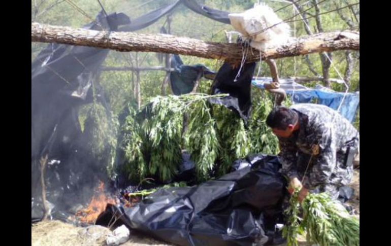 Jalisco | El pasado viernes hallaron siete predios utilizados para ello en Mamatla Localizan y destruyen sembradíos de mariguana en Jalisco El pasado viernes hallaron siete predios utilizados para ello en Mamatla Por: NTX 20 de septiembre de 2015 - 13:37 hs Se dio cuenta de los hechos a la XV Zona Militar y al MP. TWITTER / @fiscaliajal GUADALAJARA, JALISCO (20/SEP/2015).- La Fiscalía General de Jalisco informó que elementos de la Fuerza Única Regional localizaron siete terrenos sembrados con mariguana en la zona norte del estado, los cuales fueron destruidos. Subrayó que los hechos ocurrieron el pasado 18 de septiembre, cuando personal de la Fiscalía se encontraba en labores de investigación en el municipio de San Martín de Bolaños. Al llegar a un cerro de la comunidad de Mamatla, en ese municipio, los uniformados localizaron siete predios que eran utilizados como plantíos del enervante. Indicó que en siete mil 800 metros cuadrados de terreno resguardado se contabilizaron 31 mil 200 plantas de una altura aproximada de un metro 20 centímetros, las cuales estaban escondidas entre hierba seca. Precisó que dichas plantas fueron destruidas en incineradas en su totalidad por elementos de la Fuerza Única Regional. Señaló que de los hechos se dio vista a la XV Zona Militar para su conocimiento y al Ministerio Público Federal, quien seguirá con las investigaciones de su competencia. Temas Seguridad Drogas Mariguana Fiscalía de Jalisco (FGE) Fuerza Única Jalisco Recibe las últimas noticias en tu e-mail Todo lo que necesitas saber para comenzar tu día Registrarse implica aceptar los Términos y Condiciones