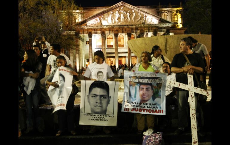 Jalisco | Cerca de 200 personas conmemoran los seis meses de desaparición de los estudiantes Madres de normalistas guían marcha en Guadalajara Cerca de 200 personas conmemoran los seis meses de desaparición de los estudiantes de Ayotzinapa Por: EL INFORMADOR 26 de marzo de 2015 - 19:24 hs La marcha transcurrió de forma pacífica y culminó en la Plaza Liberación. EL INFORMADOR / F. Atilano GUADALAJARA, JALISCO (26/MAR/2015).- Alrededor de 200 personas marcharon para conmemorar seis meses de la desaparición de los normalistas de Ayotzinapa, en una protesta encabezada por las madres de tres de los desaparecidos: Julio César Ramírez Nava, Adán Abraham de la Cruz y Jorge Antonio Tizana. La marcha partió del Parque Revolución bajo consignas de '' Ayotzinapa es México'' y ''Hasta encontrarlos'', varios de los asistentes portaban carteles que exigían la aparición de los normalistas y banderas con los nombres de los desaparecidos. Algunos de los manifestantes estaban enmascarados y otros iban caracterizados como el Presidente Enrique Peña Nieto y con botargas de ratas que simbolizaban a la política mexicana, mientras que otros llevaban cruces de madera manchadas con pintura roja. La marcha transcurrió de forma pacífica y culminó en la Plaza Liberación donde fueron recibidos con pancartas que citaban ''quisieron enterrarnos pero no sabían que éramos semillas''; en el lugar había 43 sillas con las fotografías de los normalistas. Temas Manifestaciones en Jalisco Municipios Caso Ayotzinapa Lee También Astros de Jalisco doblega a Xalapa y se pone a un juego de la Final de Zona Escuela Gómez de Mendiola celebra sus primeros 75 años al servicio de los tapatíos Proyectan expansión de Placencia Muebles Omar 'N' es vinculado a proceso por presunto abuso sexual infantil agravado Recibe las últimas noticias en tu e-mail Todo lo que necesitas saber para comenzar tu día Registrarse implica aceptar los Términos y Condiciones
