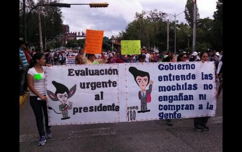Jalisco | Unos cinco mil maestros marchan contra la reforma educativa Maestros bloquean Alcalde, otra vez Unos cinco mil maestros marchan contra la reforma educativa Por: EL INFORMADOR 7 de septiembre de 2013 - 11:33 hs Los maestros muestran mensajes contra el Presidente Peña Nieto y la reforma educativa que él presentó. / GUADALAJARA, JALISCO (07/SEP/2013).- Desde las 12:00 horas, más de cinco mil maestros, según el cálculo del Ayuntamiento de Guadalajara, marchan sobre la avenida Alcalde -16 de Septiembre, en contra de la reforma educativa. En este momento están a la altura de Palacio de Gobierno, mismo que tiene resguardada su entrada con elementos de seguridad. El anuncio hecho es que el próximo miércoles habrá un paro estatal de 24 horas. Según los voceros de la marcha, una comisión de 15 maestros busca ingresar a Palacio de Gobierno para dialogar. El pasado 4 de septiembre, otra manifestación del magisterio hizo el mismo recorrido, lo que ocasionó fuertes congestionamientos vehiculares. A su llegada a la Plaza de Armas, en Pedro Moreno y 16 de Setiembre, el secretario general de Gobierno, Arturo Zamora intentó dialogar con los docentes que protestaban, pero una cincuentena de éstos lo rodearon y otros más le gritaban que se fuera. Ante esto, el secretario se devolvió a Palacio de Gobierno. Antes de cerrar una de las puertas tras de sí, le lanzaron algunos objetos. Los policías resguardaron al funcionario. La reforma educativa ''no tiene marcha atrás'', afirma Peña Nieto En la reforma educativa “ no hay marcha atrás”, afirmó el Presidente Enrique Peña Nieto. El Mandatario aseguró que su Gobierno agotará las vías del diálogo con la Coordinadora Nacional de Trabajadores de la Educación (CNTE), pero “no hay marcha atrás, la reforma educativa está, habrá de promulgarse”. Por ello, las tres leyes secundarias aprobadas por el Congreso en torno a esta reforma se publicarán a su regreso a México, luego de su participación en la Cumbre del G-20 en San Petersburgo, Rusia. Con información de Roberto Medina. Temas Manifestaciones en Jalisco Vialidad Reforma Educativa Secretaría de Movilidad Recibe las últimas noticias en tu e-mail Todo lo que necesitas saber para comenzar tu día Registrarse implica aceptar los Términos y Condiciones