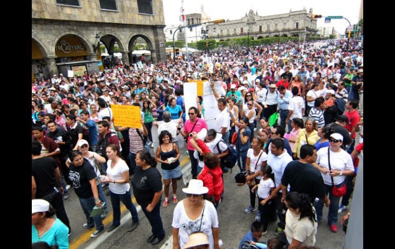 Jalisco | Liberan avenida Alcalde; anuncian que el miércoles harán un paro estatal de 24 horas Maestros entregan pliego petitorio Liberan avenida Alcalde; anuncian que el miércoles harán un paro estatal de 24 horas Por: EL INFORMADOR 7 de septiembre de 2013 - 17:30 hs Más de cinco mil maestros marcharon desde La Normal hasta la Avenida Juárez. / GUADALAJARA, JALISCO (07/SEP/2013).- Primero pedían ver al gobernador, pero después bajaron su exigencia. Los más de cinco mil maestros que marcharon desde La Normal hasta la Avenida Juárez, por la Avenida Alcalde-16 de Septiembre, desbloquearon esta última vía tras entregar un pliego petitorio al Ejecutivo estatal. El encargado de recibir el documento fue Roberto López, titular de la oficina de Asuntos del Interior, dependiente de la Secretaría General de Gobierno. Juan Carlos Balderas, integrante del movimiento de Bases Magisteriales, explicó que en el pliego piden al gobernador Aristóteles Sandoval intervenir ante la Presidencia para que la reforma educativa sea vetada. Gente de la Secretaría General de Gobierno agregó que entre las peticiones también está que el Congreso del Estado impulse una controversia constitucional contra la aprobación de la referida reforma. Juan Carlos Balderas recordó que el próximo miércoles habrá un paro estatal de 24 horas. Otra convocatoria que tuvo lugar es para el próximo sábado, cuando maestros de todo el Estado se reunirán para analizar las reformas propuestas por la Presidencia, como la energética y la fiscal, además de la educativa. EL INFORMADOR / ROBERTO MEDINA Temas Manifestaciones en Jalisco Municipios Reforma Educativa Lee También Recuperan camión de carga robado en Tlajomulco Denuncia en su contra es para ocultar un fraude: Hermana de Omar "N" Protección Civil reabre el malecón de Puerto Vallarta Detienen a asesino de joven en partido de futbol Recibe las últimas noticias en tu e-mail Todo lo que necesitas saber para comenzar tu día Registrarse implica aceptar los Términos y Condiciones