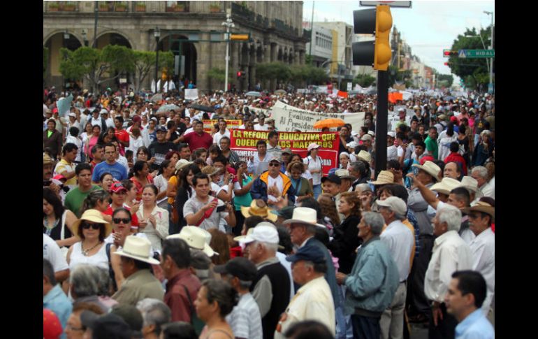Jalisco | Se reunirán el próximo miércoles Maestros logran mesa de diálogo con Gobierno estatal Los docentes buscan que Aristóteles Sandoval interponga una controversia constitucional contra la Reforma Educativa Por: EL INFORMADOR 22 de septiembre de 2013 - 04:18 hs La Unidad Estatal de Protección Civil y Bomberos de Jalisco calculó el número de manifestantes en cuatro mil. EL INFORMADOR / GUADALAJARA, JALISCO (22/SEP/2013).- Alrededor de las dos de la tarde de ayer, mientras los manifestantes mantenían bloqueada la Avenida 16 de Septiembre, entre Juárez e Hidalgo, y con eso trastornado el tráfico en el Centro tapatío por tercer sábado consecutivo, cerca de 20 maestros entraron a Palacio de Gobierno para entregarle un pliego petitorio a Arturo Zamora, secretario general de Gobierno. De ese encuentro salió el acuerdo para que, el próximo miércoles, la autoridad estatal y los docentes se reúnan para discutir las bases jurídicas de sus exigencias. Los maestros insistieron en la petición que también plantearon en los dos anteriores sábados de marcha por el Centro: que el Ejecutivo local interponga una controversia constitucional contra la Reforma Educativa. Los maestros que se quedaron en la Avenida 16 de Septiembre mientras sus compañeros estaban en el recinto estatal acordaron hacer paro de labores el próximo miércoles. La marcha partió desde la Normal después de las 11:00 horas. Las consignas no variaron en comparación con las pasadas protestas: “¡Si Peña reprueba, también se queda fuera!”; “¡El maestro, luchando, también está enseñando!”. Cada quien usó sus cifras. Mientras la Unidad Estatal de Protección Civil y Bomberos de Jalisco afirma que marcharon cuatro mil inconformes, los maestros mencionan que fueron 28 mil. El mitin se dio por terminado alrededor de las 14:45 horas, pero los inconformes tardaron cerca de media hora en despejar 16 de Septiembre. Temas Manifestaciones en Jalisco Gobierno del Estado Reforma Educativa Lee También Clausuran centro de rehabilitación en Tonalá por posibles delitos ¿Será obligatorio presentar la CURP biométrica para trámites escolares? Presentan a los cinco finalistas del Premio Adolf B Horn Hombre es condenado por abuso sexual cometido contra su hijastro Recibe las últimas noticias en tu e-mail Todo lo que necesitas saber para comenzar tu día Registrarse implica aceptar los Términos y Condiciones