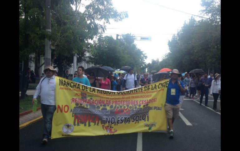 GUADALAJARA, JALISCO (20/JUL/2017).- Una manisfestación de maestros del Sindicato del Colegio de Bachilleres y de bases magisteriales de la CNTE provoca el cierre de la avenida Vallarta esta tarde.Aproximadamente 300 personas iniciaron su marcha desde la glorieta Minerva poco después de las 15:00 horas para dirigirse al Palacio de Gobierno por la citada avenida en sentido contrario.Elementos de la Secretaría de Movilidad se encuentran en la manifestación para hacer cortes a la circulación a lo largo de la avenida hasta el Centro Tapatío.Con cantos y pancartas, los inconformes se manifiestan contra la Reforma Educativa.Uno de los contingentes en la marcha, la Juventud Comunista de México, pide en panfletos la reisntalación de 181 docentes del Colegio de Bachilleres que sostiene, fueron injustamente despedidos.