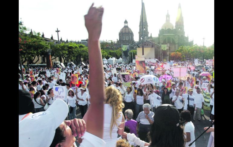 Jalisco | Pretenden reunir 50 mil firmas contra el aborto y los matrimonios del mismo sexo Marchan a favor de la vida y la familia Cuatro contingentes partieron de distintos puntos de la ciudad para encontrarse en Plaza de la Liberación y unir fuerzas contra la reforma constitucional Por: EL INFORMADOR 15 de mayo de 2011 - 04:54 hs Miles de personas se congregaron ayer en la Plaza de la Liberación contra las Reformas que plantean legalizar el aborto. A. GARCÍA / GUADALAJARA, JALISCO (15/MAY/2011).- Miles de personas que se pronunciaron a favor de la vida y de la familia llegaron ayer a las 17:30 horas a la Plaza de la Liberación para hacer una petición concreta: rechazar la reforma constitucional que plantea la legalización del aborto y el derecho a tener seguro social entre parejas del mismo sexo. La coalición nacional “Mexicanos por la vida” organizó la marcha, que partió desde cuatro diferentes ubicaciones: El Expiatorio, La Minerva, La Normal y Plaza de la Bandera. El contingente que partió del primer punto fue el más numeroso, con casi siete mil tapatíos, según organizadores. Con mantas de todos tamaños, hicieron alusión a su deseo de respetar la vida y la familia, “como lo mandan las leyes de la naturaleza”. “Yo si le voy le voy a la vida”, entonaban los manifestantes, entre los que figuraban grupos de diferentes congregaciones religiosas, jóvenes y adultos vestidos de blanco. A un costado de la tarima donde los líderes de la coalición externaban los motivos de su movilización instalaron un par de mesas para recabar firmas de los detractores a la reforma constitucional. “Se las vamos a enviar a los senadores para que vean que los jóvenes no estamos de acuerdo con el aborto y las uniones del mismo sexo. Estamos a favor de la familia”, afirmó David, uno de los jóvenes organizadores. Su intención es alcanzar 50 mil firmas en Jalisco, que sumadas a las que presentarán otros estados del país, puedan frenar la aprobación de la iniciativa. EL INFORMADOR / VIOLETA MELÉNDEZ Temas Manifestaciones en Jalisco Municipios Reformas constitucionales Lee También Ratifican a Consuelo González como magistrada del Supremo Tribunal de Justicia de Jalisco Rechazan ratificar a Espinosa Licón como magistrado del Supremo Tribunal de Justicia Lemus respalda a productores de maíz y reconoce su reclamo 'por un precio justo' Lemus afirma que no habrá impunidad desde el Estado en el caso de la detención de Nazario 'N' Recibe las últimas noticias en tu e-mail Todo lo que necesitas saber para comenzar tu día Registrarse implica aceptar los Términos y Condiciones