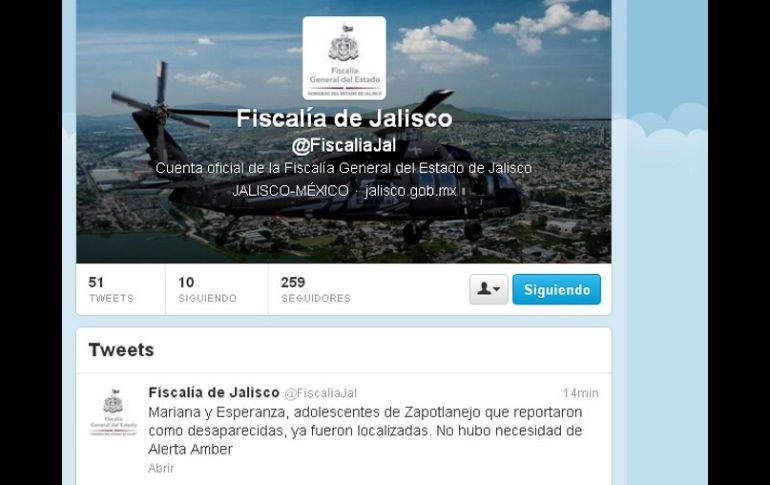 Jalisco | La Fiscalía informa mediante su cuenta de Twitter que las menores fueron localizadas Menores desaparecidas en Zapotlanejo son localizadas La Fiscalía informa mediante su cuenta de Twitter que las menores fueron localizadas Por: EL INFORMADOR 25 de junio de 2013 - 16:32 hs Imagen del tuit emitido por la Fiscalía del Estado. ESPECIAL / GUADALAJARA, JALISCO (25/JUN/2013).- La Fiscalía General del Estado de Jalisco informa, mediante su cuenta de twitter @FiscaliaJal, que las dos menores de edad desaparecidas en Zapotlanejo ya fueron localizadas. La FGE detalla que debido a esto no hubo necesidad de activar la Alerta Amber: “@FiscaliaJal Mariana y Esperanza, adolescentes de Zapotlanejo que reportaron como desaparecidas, ya fueron localizadas. No hubo necesidad de Alerta Amber” Posteriormente, la Fiscalía informó que las menores decidieron salir por su propia voluntad, debido a problemas con sus padres: "@FiscaliaJal Menores de Zapotlanejo refieren que decidieron salir de sus viviendas por su propia voluntad. Argumentan problemas con sus padres." Más tarde, el fiscal general, Luis Carlos Nájera, dará una rueda de prensa para dar los detalles del caso y los avances sobre la desaparición de los adolescentes Luis Antonio Ortiz Guerra y Andrés Barba Olivas —ambos de 15 años, quienes fueron vistos por última vez en un centro comercial de Zapopan—; y una infante, Nancy, de 19 meses, que al parecer, el 22 de junio, fue despojada de los brazos de su madre en el cruce de Lázaro Cárdenas y 8 de Julio, en Guadalajara. Temas Seguridad Desapariciones y denuncias Fiscalía de Jalisco (FGE) Recibe las últimas noticias en tu e-mail Todo lo que necesitas saber para comenzar tu día Registrarse implica aceptar los Términos y Condiciones