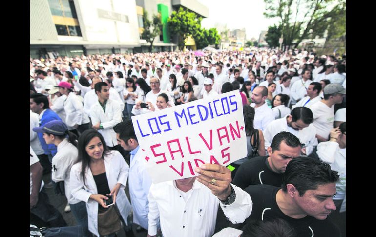 Jalisco | El movimiento #yosoymédico17 sale a manifestarse Miles de médicos respaldan a 16 colegas del IMSS inculpados El grupo de manifestantes apoya a los médicos inculpados por supuesta mala praxis Por: EL INFORMADOR 23 de junio de 2014 - 03:17 hs UNIDOS. Miles de trabajadores de la salud salieron ayer a la calle; exigen no ser criminalizados. / GUADALAJARA, JALISCO (23/JUN/2014).- “Somos médicos, no somos dioses ni criminales”, es la frase que miles de personas gritaron ayer en apoyo a los 16 médicos del Instituto Mexicano del Seguro Social (IMSS) que han sido inculpados por una supuesta mala praxis. La de ayer fue la primera manifestación del Movimiento #yosoymédico17. “No estamos pidiendo que se despenalice el acto médico, lo que queremos es que no se criminalice”, dijo Jorge Estrafón, uno de los cinco líderes del movimiento, quien entregó un pliego petitorio en la delegación de la Procuraduría General de la República ( PGR). De acuerdo con estimaciones de los organizadores hubo 12 mil personas, aunque dos agentes de la Policía vial que fueron consultados estimaron cinco mil manifestantes. Se trata de la primera acción del colectivo que se replicó en 70 comunidades y varias ciudades del país. Temas Manifestaciones en Jalisco Municipios Salud pública Lee También Harfuch y los medios Gobierno federal refuerza combate a extorsión y desapariciones Cartucho Astros de Jalisco toma ventaja sobre Xalapa en la semifinal de zona Recibe las últimas noticias en tu e-mail Todo lo que necesitas saber para comenzar tu día Registrarse implica aceptar los Términos y Condiciones