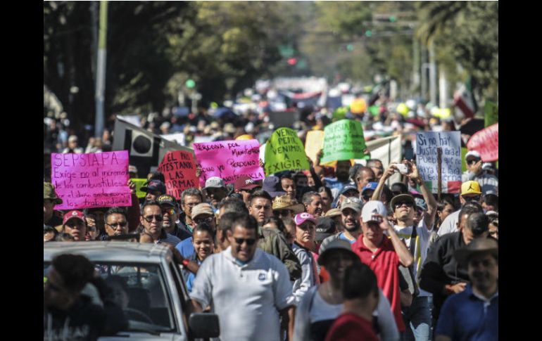 GUADALAJARA, JALISCO (23/ENE/2017).- Como parte de las protestas que se desarrollaron ayer en contra del gasolinazo, ciudadanos se hicieron presentes a las afueras del Congreso para dejar pancartas y hacer un llamado a los diputados para que intervengan en la reversa al aumento del Impuesto Especial sobre Producción y Servicios (IEPS) que se aplica a las gasolinas.Asimismo, al pasar por Palacio de Gobierno, manifestantes pegaron letreros en la puerta principal y vallas colocadas alrededor del edificio, en su mayoría se leía la leyenda: “Fuera Peña Nieto”.Según Protección Civil, cerca de 35 mil personas participaron en la megamarcha que partió de cuatro puntos distintos: la Minerva, el Parque Rojo, la calzada Independencia y Juárez, y la Olímpica.Al final, los manifestantes, tanto ciudadanos como de diferentes agrupaciones y sectores, se concentraron en la Plaza de la Liberación, donde entonaron el Himno Nacional y se repitieron los audios de algunos mensajes del Presidente Enrique Peña Nieto, a los que gritaron: “Fuera”, lo cual se aplicó también para un grupo de personas que entregaban volantes del Movimiento Regeneración Nacional (Morena).El director de Protección Civil y Bomberos de Guadalajara, Felipe de Jesús López Sahagún, informó que las marchas se desarrollaron sin contratiempos, “sigue la gente siendo muy pacífica muy tranquila al manifestarse, sin novedad, solamente una persona que atendimos porque se le bajó la presión”.Protesta toma la Vía RecreActivaLa manifestación en contra del gasolinazo convocada por ciudadanos partió cerca de las 10:20 horas de La Minerva hacia el centro de Guadalajara sobre avenida Vallarta, la cual tomaron de nuevo en su totalidad pese a ser la arteria principal de la Vía RecreActiva.Al inicio de la marcha los organizadores solicitaron en un par de ocasiones dejar libres algunos carriles para el paso de los ciclistas que transitaban de Oriente a Poniente, sin embargo esto no sucedió, lo que provocó que elementos de Protección Civil y Bomberos de Guadalajara reportaran inicialmente la presencia de más de 40 mil personas, ya que se mezclaban los usuarios del paseo dominical con los manifestantes (en una fila de 1.2 kilómetros). Durante el recorrido, se solicitó también que marcharan con la cara descubierta pues se trataba de una manifestación pacífica, para evitar hechos como los ocurridos el pasado 2 de enero cuando un grupo fue dispersado por los elementos de seguridad con gas lacrimógeno.