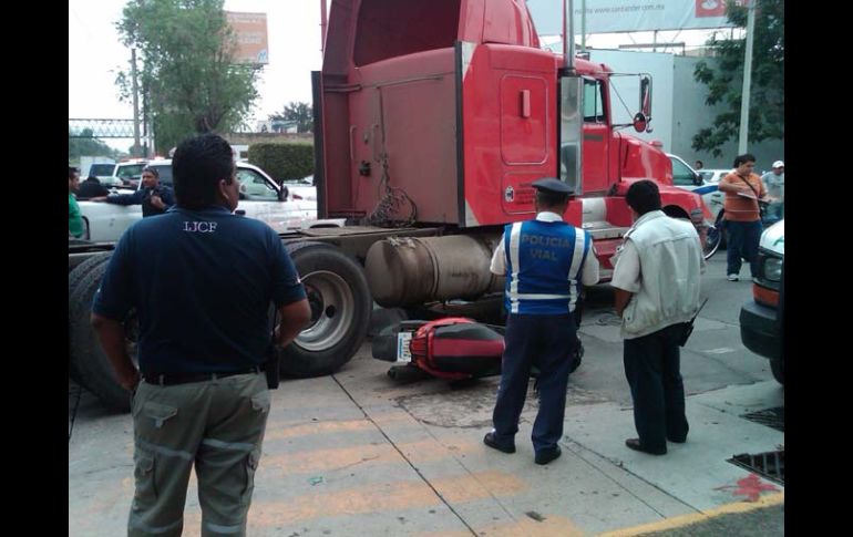 Jalisco | La víctima traía en una mochila una fuerte cantidad de dinero en efectivo Motociclista pierde la vida al ser arrollado por un tráiler en Guadalajara Cuando un vehículo de carga pretendía dar vuelta, le interrumpió la circulación a un motociclista y lo arrolló Por: EL INFORMADOR 9 de julio de 2010 - 12:37 hs La motocicleta quedó a un lado del tráiler y el cuerpo debajo de él. M. PATIÑO / GUADALAJARA, JALISCO (09/JUL/2010).- En el cruce de la calle 4 y la Calzado Lázaro Cárdenas, un motociclista perdió la vida al ser arrollado por un tráiler. Los hechos se registraron cuando el vehículo de carga pretendía dar vuelta hacía la calle 4, en la Zona Industrial, en Guadalajara; en ese momento interrumpió la circulación del fallecido, quien fue identificado con el nombre de Martín Alejandro Castañeda Sánchez, de 26 años de edad, con domicilio en la colonia Ladrón de Guevara, quien presumiblemente era de oficio mensajero. Elementos de la Policía municipal de Guadalajara detuvieron a Víctor Lizarraga, quien conducía el carguero. La víctima quedó debajo del tráiler y la motocicleta a un costado. Elementos del Instituto Jalisciense de Ciencias Forenses (IJCF) al hacer un inventario de las pertenencias de la víctima en una mochila traía una fuerte cantidad de dinero en efectivo y diversa documentación. EL INFORMADOR / MARTÍN PATIÑO Temas Seguridad Accidentes con muertes en Jalisco Policía de Guadalajara SVyT Lee También Jalisco reporta una tendencia a la baja en desapariciones Darán capacitación a ingenieros para transparentar la obra pública Bajan lluvias el sábado en Guadalajara, pero se mantiene nublado Fallece Junior Dutra al realizarse cirugía estética en manos de dentista sin licencia Recibe las últimas noticias en tu e-mail Todo lo que necesitas saber para comenzar tu día Registrarse implica aceptar los Términos y Condiciones