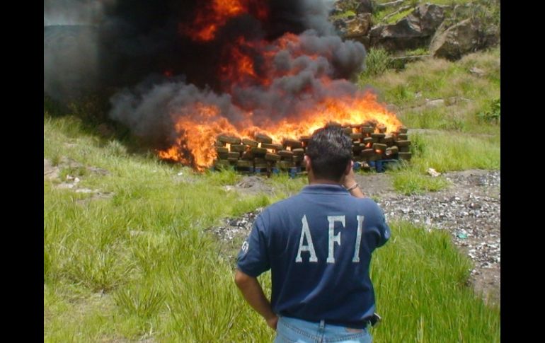 Jalisco | Relacionada con más de mil expedientes por delitos contra la salud PGR incinera más de dos toneladas de droga La mayoría de la droga destruida se trataba de mariguana Por: EL INFORMADOR 6 de agosto de 2010 - 16:35 hs Personal de la AFI participó en la destrucción de la droga. ESPECIAL / GUADALAJARA, JALISCO (06/AGO/2010).- Este miércoles en las instalaciones del Club Cinegético de la Venta del Astillero, elementos de la PGR se encargaron de la incineración de más de dos toneladas de drogas aseguradas en Jalisco. Según información de la PGR la droga destruida se encuentra relacionada con más de mil expedientes integrados por la comisión de delitos contra la salud, y su contenido consistió en: Una tonelada 925 kilos de mariguana. 10 kilos de semilla de mariguana. 257 plantas de mariguana. 79 kilos metanfetamina. 14 kilos de cocaína. Mil 81 pastillas psicotrópicas. Elementos del personal operativo y administrativo de la Procuraduría General de la República participaron en el acto de incineración, además un representante del Órgano Interno de Control de la insititución dio fé de la autenticidad y peso de la droga que fue quemada. Temas Seguridad PGR Decomisos de droga en Jalisco Recibe las últimas noticias en tu e-mail Todo lo que necesitas saber para comenzar tu día Registrarse implica aceptar los Términos y Condiciones