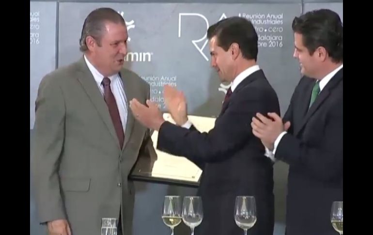 GUADALAJARA, JALISCO (06/OCT/2016).- La Confederación de Cámaras Industriales de los Estados Unidos Mexicanos (Concamin) y el Presidente de la República, Enrique Peña Nieto entregaron un reconocimiento al director general de EL INFORMADOR, Carlos Álvarez del Castillo, por la trayectoria del medio, que este miércoles cumplió 99 años de existencia.“Quiero hacer un brindis por el medio de comunicación más importante de esta entidad y uno de los más antiguos del país. Desde su fundación, EL INFORMADOR ha sido testigo del crecimiento de Jalisco, de México y el mundo, así como de los cambios. Es un medio que ha sabido adaptarse a los cambios y al gusto de sus lectores”.El primer Mandatario resumió la vida del diario, mencionando a sus tres directores y reconociendo la labor de cada uno. “Gracias a su liderazgo, es un referente periodístico a nivel nacional”.Para finalizar, Peña Nieto deseó éxito al diario. Esto se realizó en la comida inaugural de la Reunión Anual de Industriales, que se realiza en Guadalajara.EL INFORMADOR / ELIZABETH MONDRAGÓN