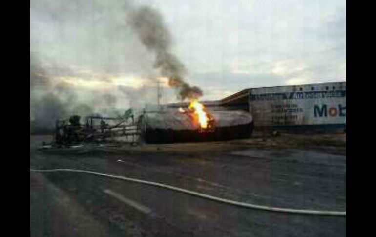 Jalisco | El percance ocurre entre el vehículo de carga y un particular Pipa de combustible se incendia en Autlán El percance ocurre entre el vehículo de carga y un particular Por: EL INFORMADOR 27 de septiembre de 2013 - 20:08 hs El accidente provoca que el camión se incendiara. ESPECIAL / GUADALAJARA, JALISCO (27/SEP/2013).- Una pipa que transportaba combustible protagonizó un accidente que involucró a un vehículo particular, lo que provocó que el camión se incendiara; lo anterior, en el municipio de Autlán de Navarro. El percance ocurrió a la altura del kilómetro 193 de la carretera federal 80, a la altura del crucero a Lo Arado, hacia las 19:00 horas. Al parecer, el vehículo de carga contenía 35 mil litros de combustible. Tras el accidente, acudieron al lugar unidades de Bomberos y Protección Civil de Autlán; hacia las 20:00 horas, los elementos ya habían controlado el siniestro. Temas Seguridad Accidentes Bomberos Lee También Detienen a presunto extorsionador del sector limonero en Michoacán Inicia el Semestre Semilla en beneficio de las hijas e hijos de policías de Jalisco Aseguran vehículo "Monstruo" en Teocaltiche Pasos para tramitar permiso de instalar vidrios polarizados en tu coche Recibe las últimas noticias en tu e-mail Todo lo que necesitas saber para comenzar tu día Registrarse implica aceptar los Términos y Condiciones